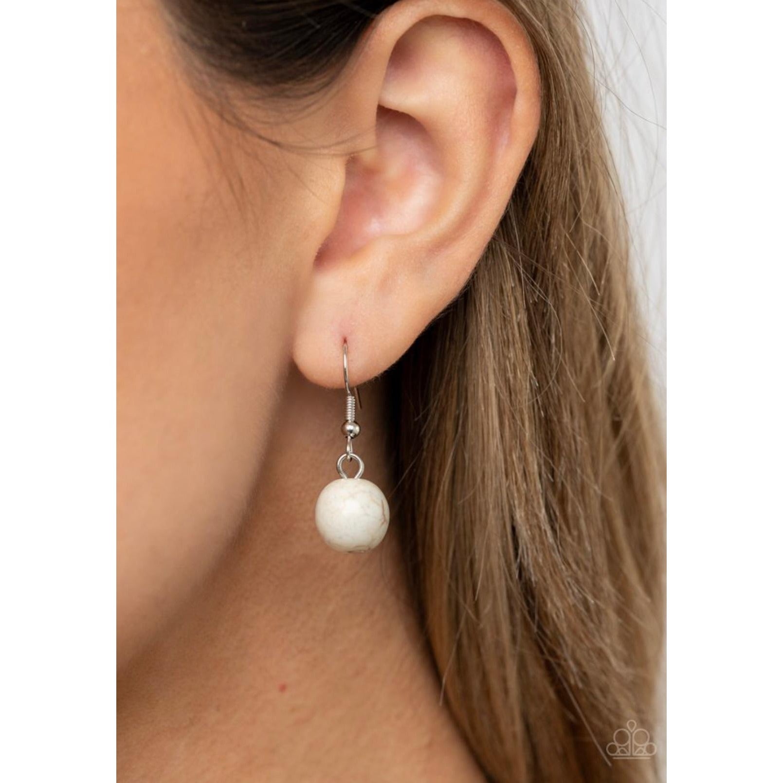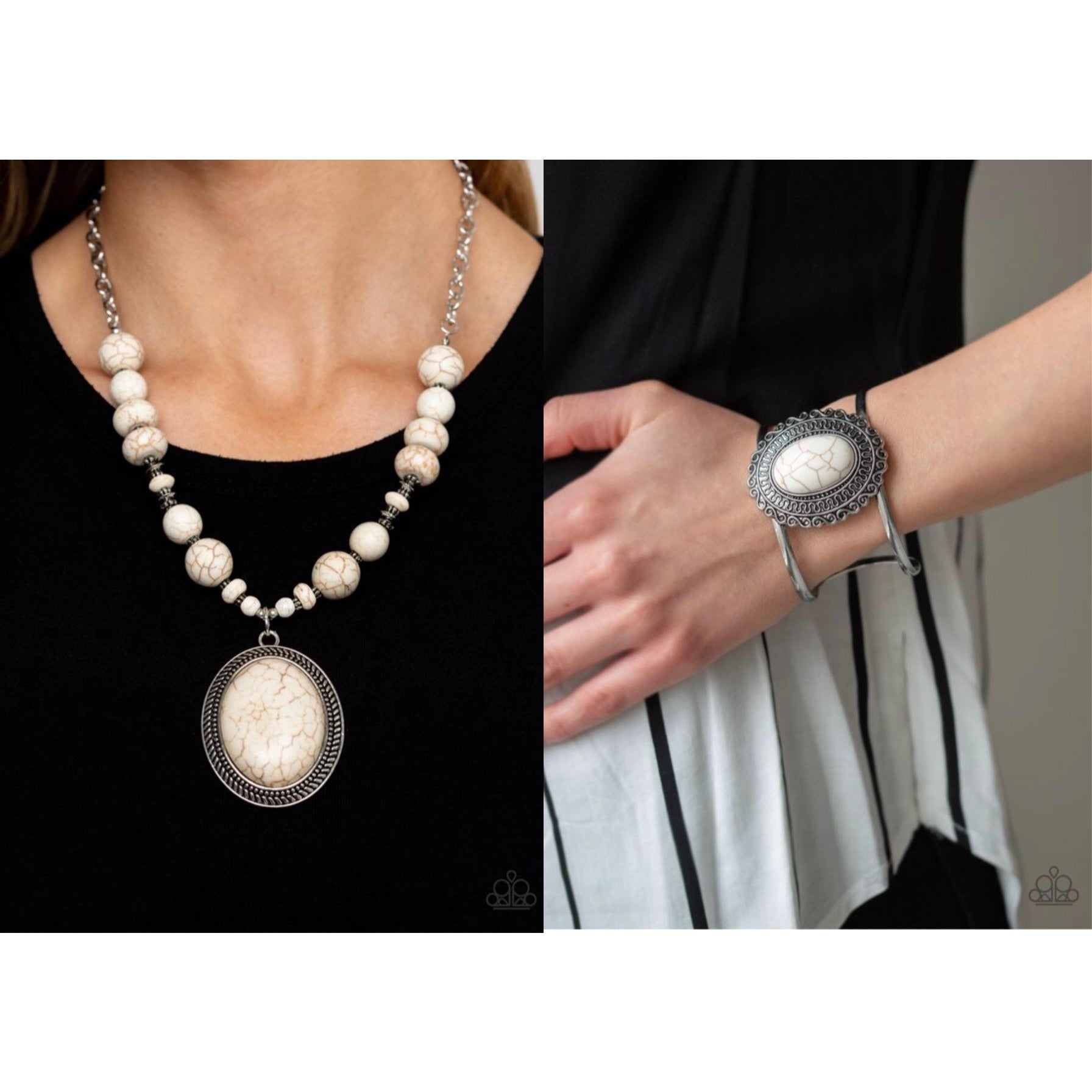 A mismatched collection of white stone beads and antiqued silver accents are threaded along an invisible wire attached to a shimmery silver chain. Bordered in a metallic rope-like silver frame, a dramatically oversized white stone pendant swings from the earthy compilation for an authentically artisan finish. Features an adjustable clasp closure.