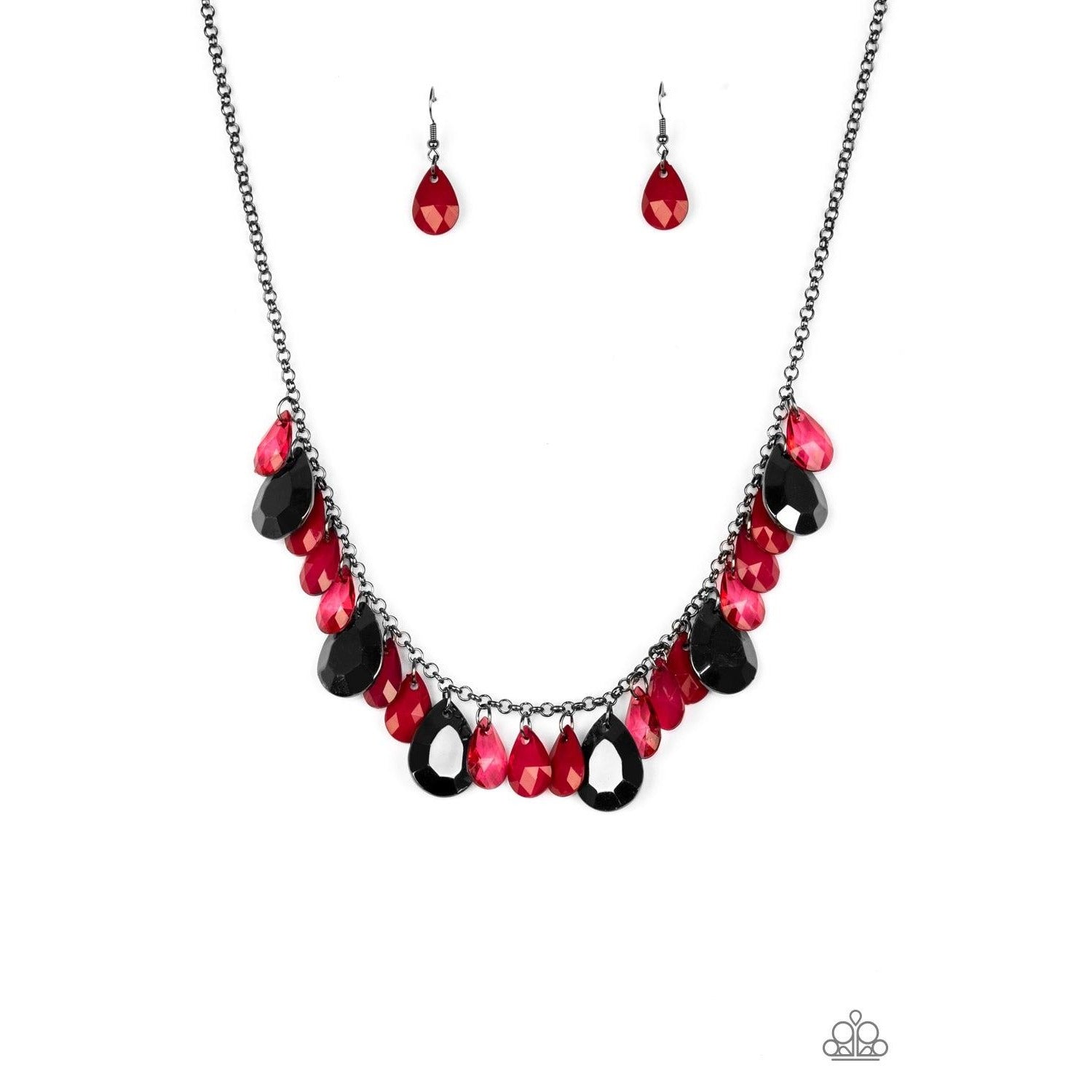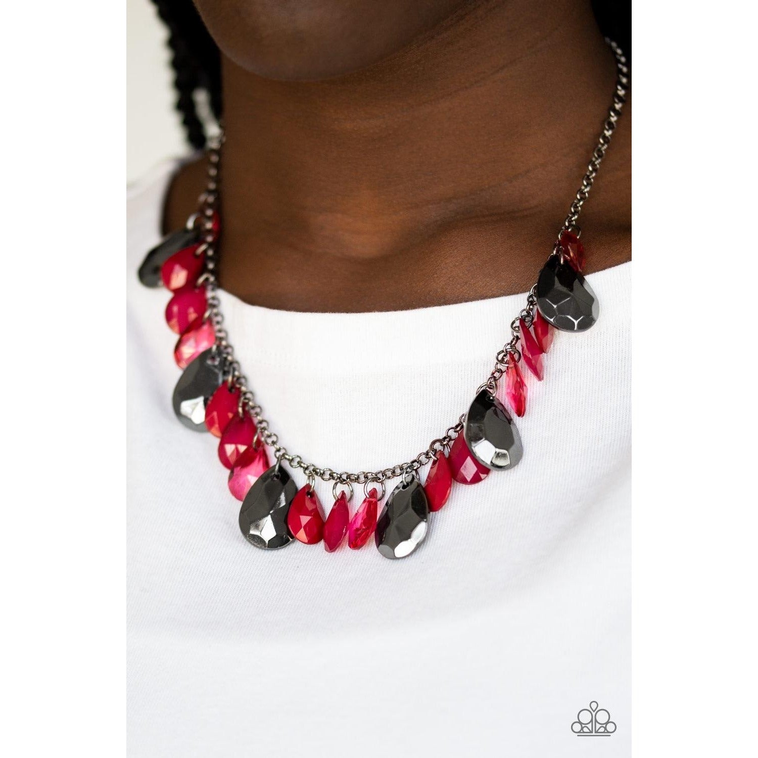 Tinted in the robust shade of Wine, glassy and polished red teardrops drip from the bottom of a shimmery gunmetal chain. Faceted gunmetal teardrops trickle between the colorful beading, adding a flashy finish to the flirtatious fringe. Features an adjustable clasp closure.