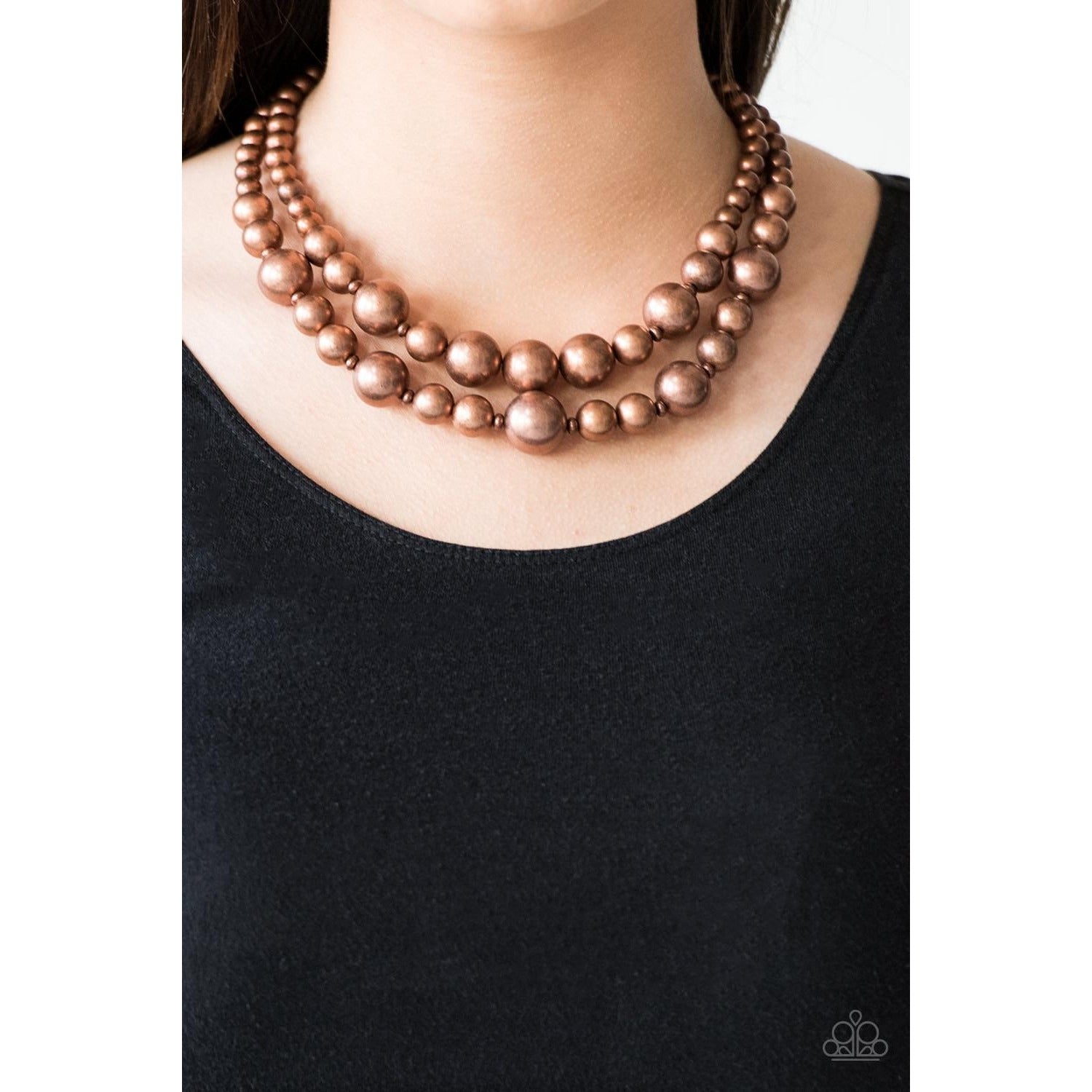 Gradually increasing in size near the center, strands of antiqued copper beads are threaded along invisible wires below the collar for a daring look. Features an adjustable clasp closure.