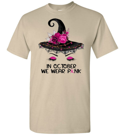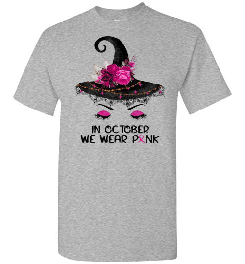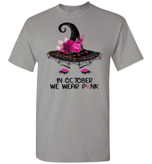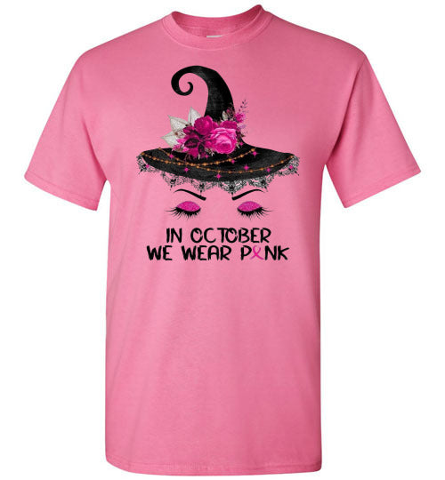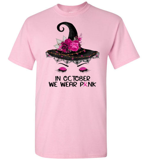 In October We Wear Pink Breast Cancer Awareness Witch Halloween Tee Shirt Top T-Shirt