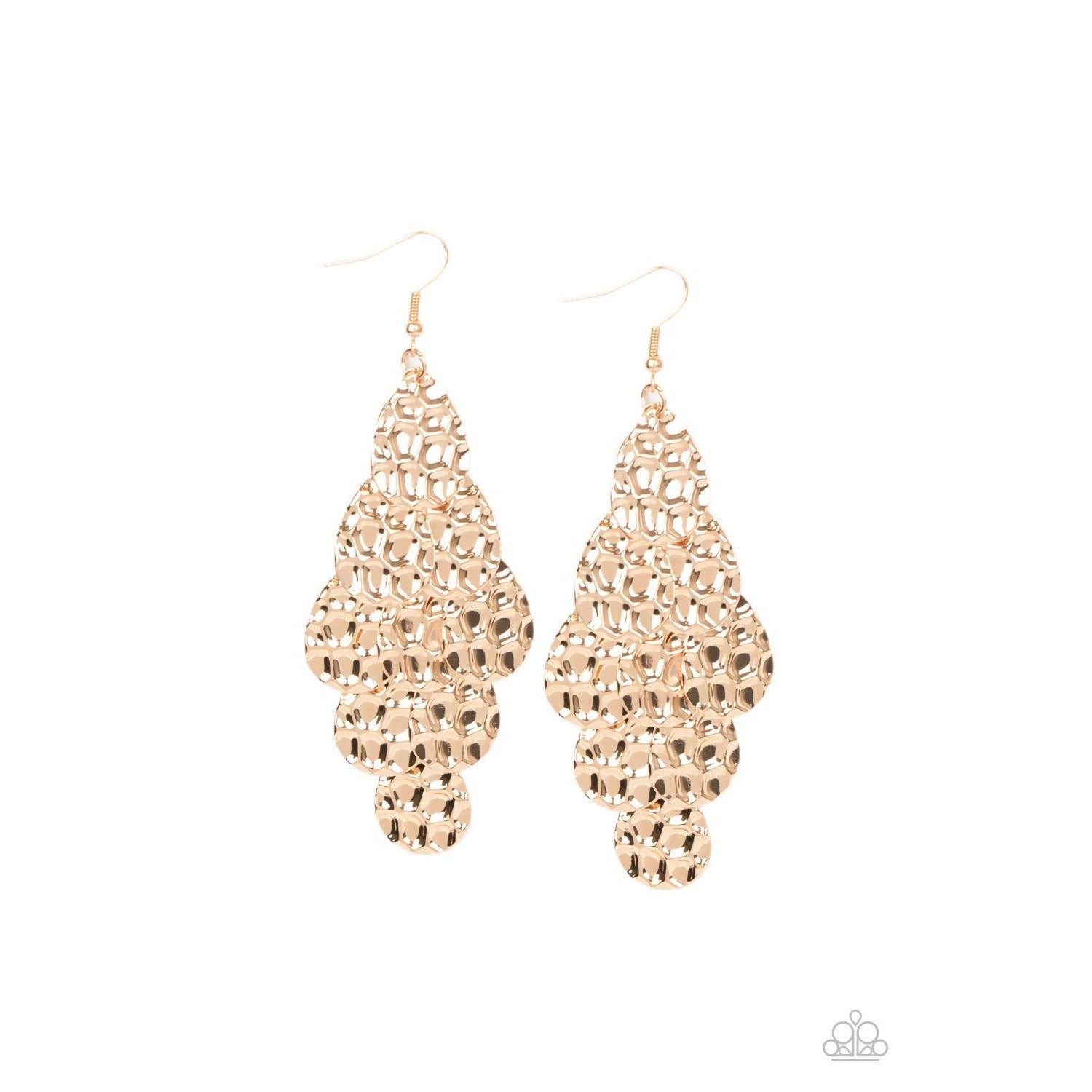 Featuring metallic honeycomb-like patterns, glistening gold teardrop frames cascade from the ear, coalescing into a noise-making lure. Earring attaches to a standard fishhook fitting.
