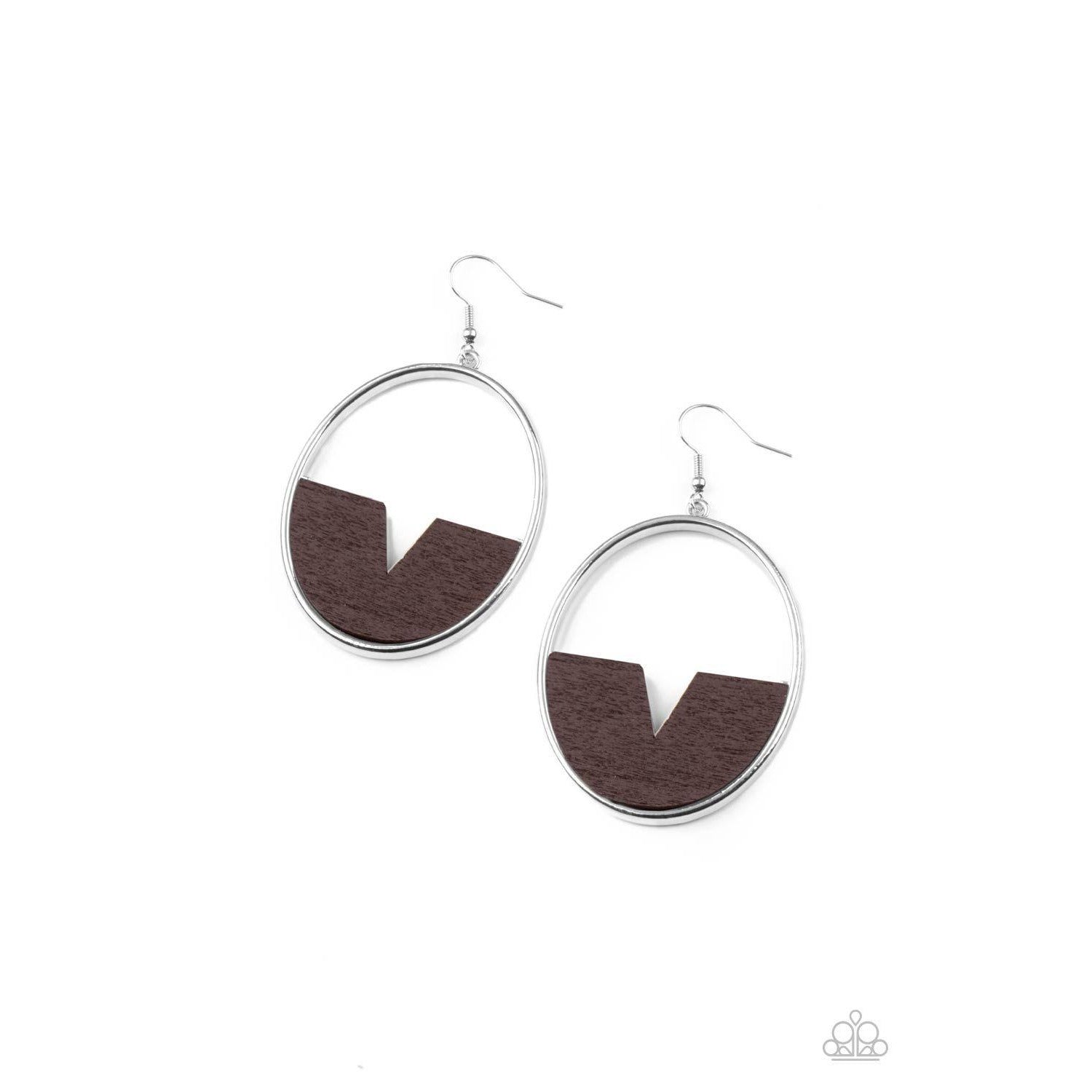 Featuring a triangular cut, a crescent shaped brown wooden frame is fitted in place along the bottom of a shiny silver hoop, creating a retro lure. Earring attaches to a standard fishhook fitting.