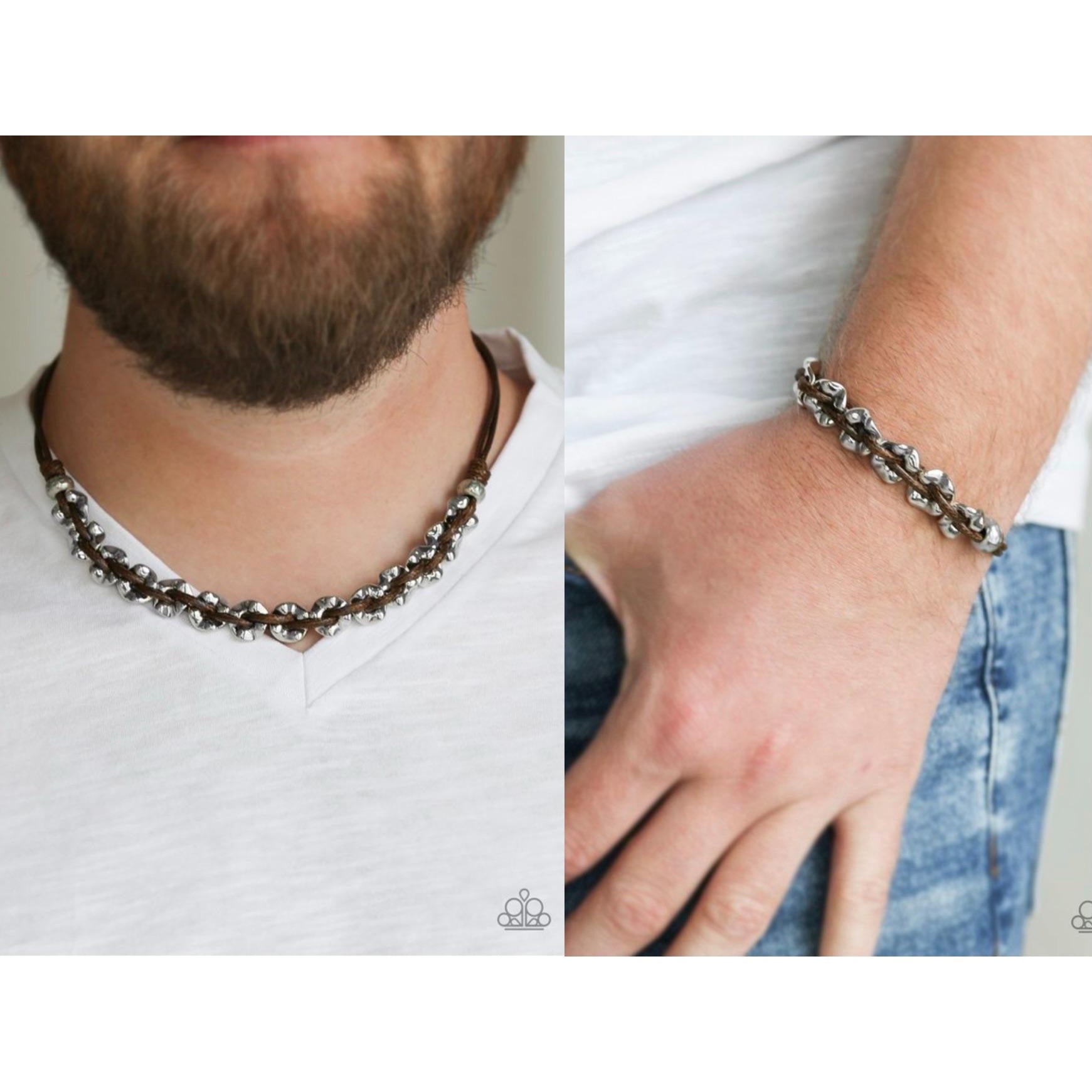 Shiny brown cording weaves through hammered silver beads around the wrist for an urban look. Features an adjustable sliding knot closure.