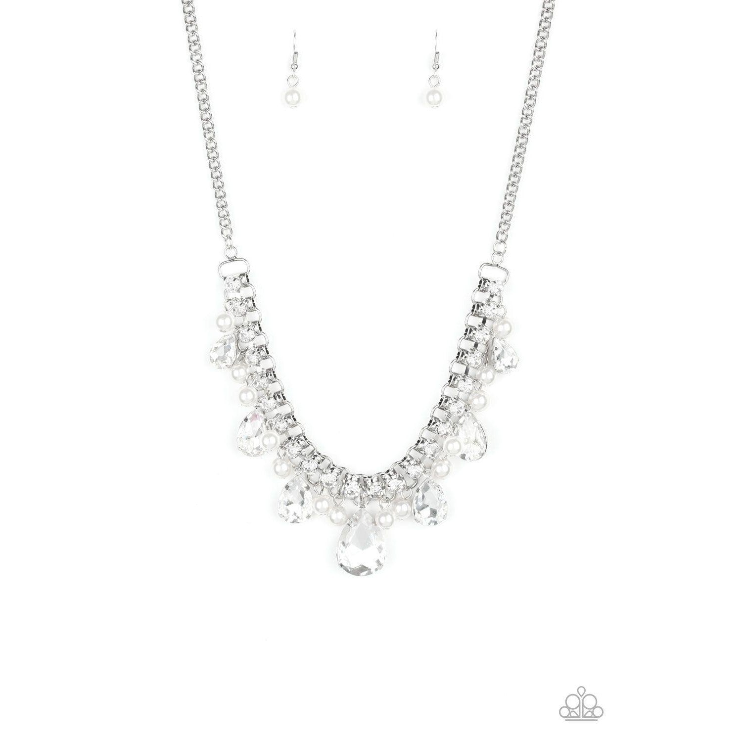 A glamorous collection of bubbly white pearls and exaggerated white teardrop gems dangle from a bold strand of white rhinestones, creating a knockout fringe below the collar. Features an adjustable clasp closure.