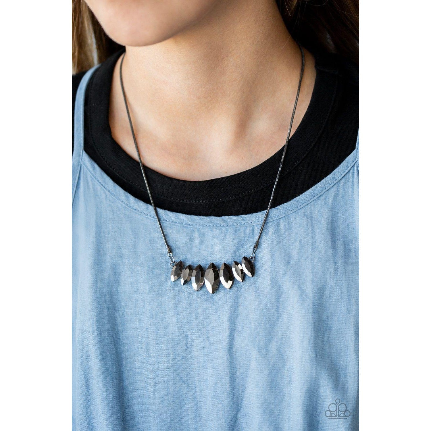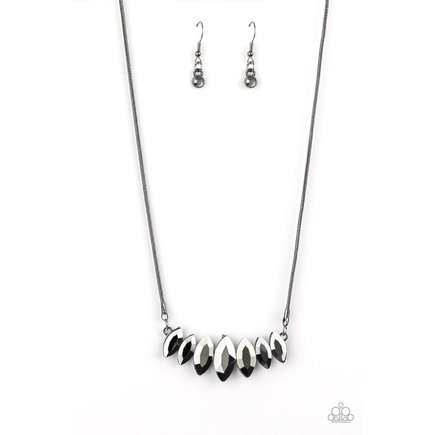 Gradually increasing in size near the center, glittery hematite marquise shaped gems link below the collar for a dramatic look. Features an adjustable clasp closure.