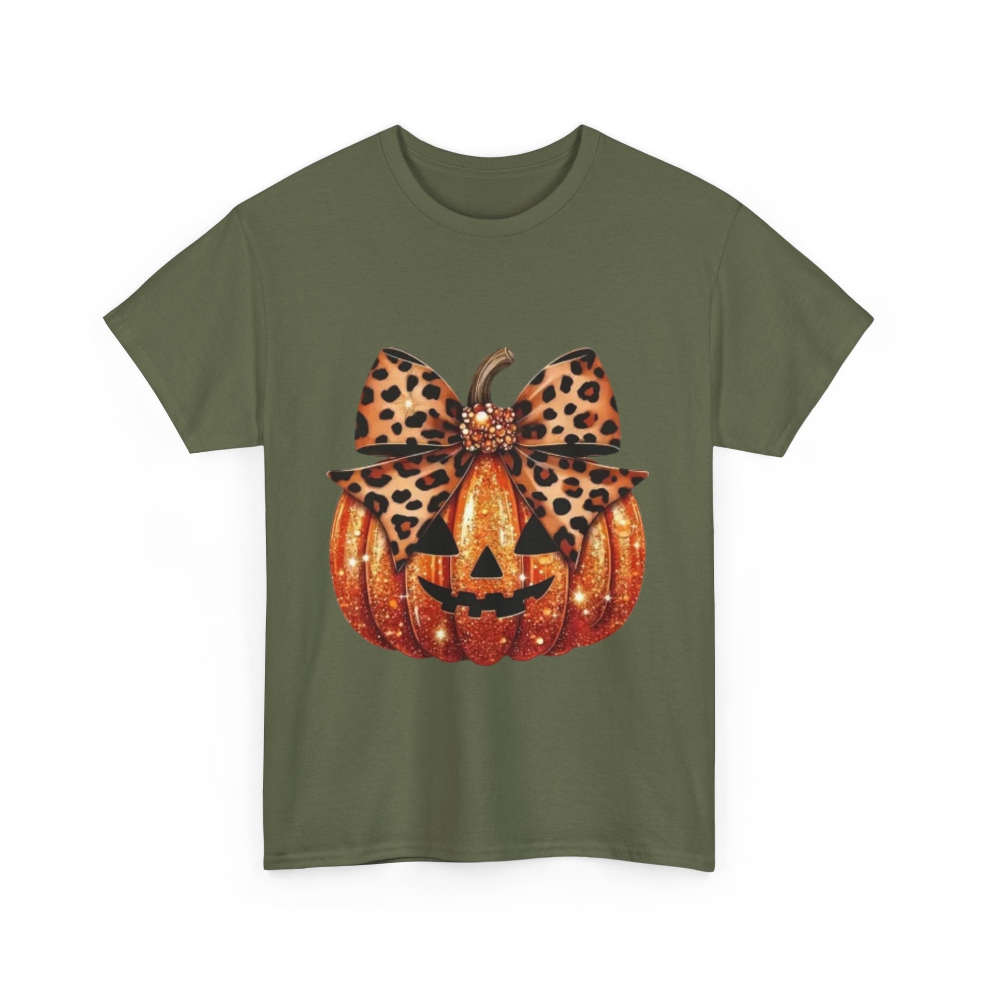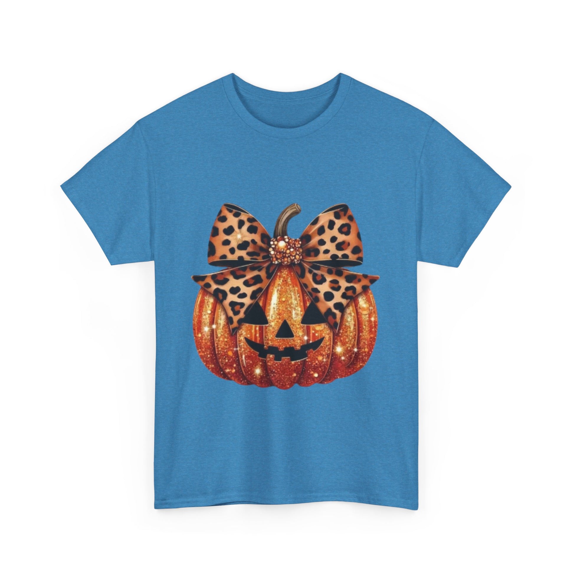 Elevate your wardrobe with this Unisex Heavy Cotton Tee, designed for comfort and style. The shirt features a playful pumpkin design adorned with a chic leopard print bow, perfect for embracing the festive spirit of Halloween. Whether you're headed to a spooky party, enjoying a fall festival, or simply lounging at home, this tee offers a relaxed fit that complements any casual or semi-formal occasion. It's an ideal choice for anyone looking to add a touch of fun and personality to their outfit, making it a great gift for friends and family who love the autumn season. Celebrate Halloween or express your love for fall with this eye-catching tee!