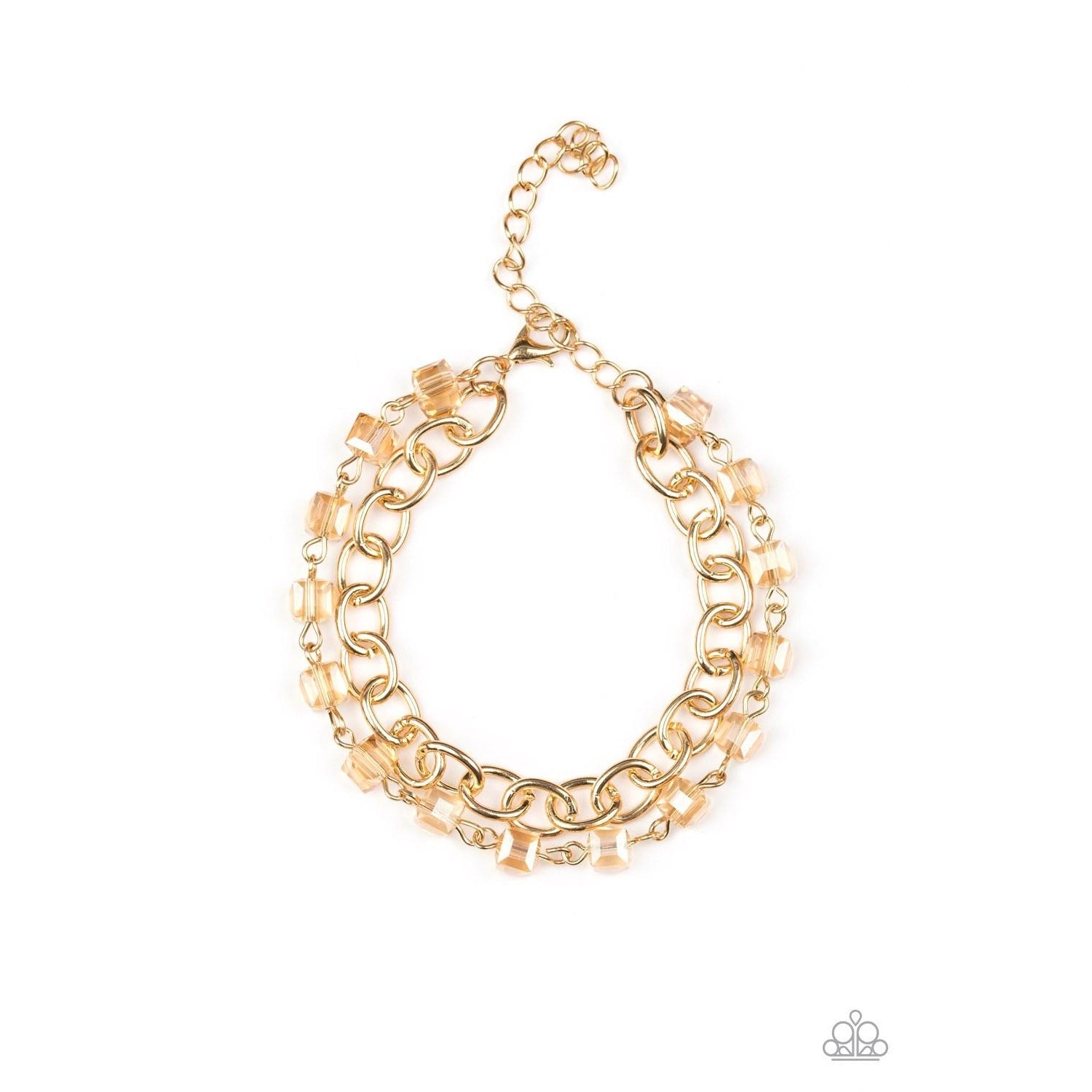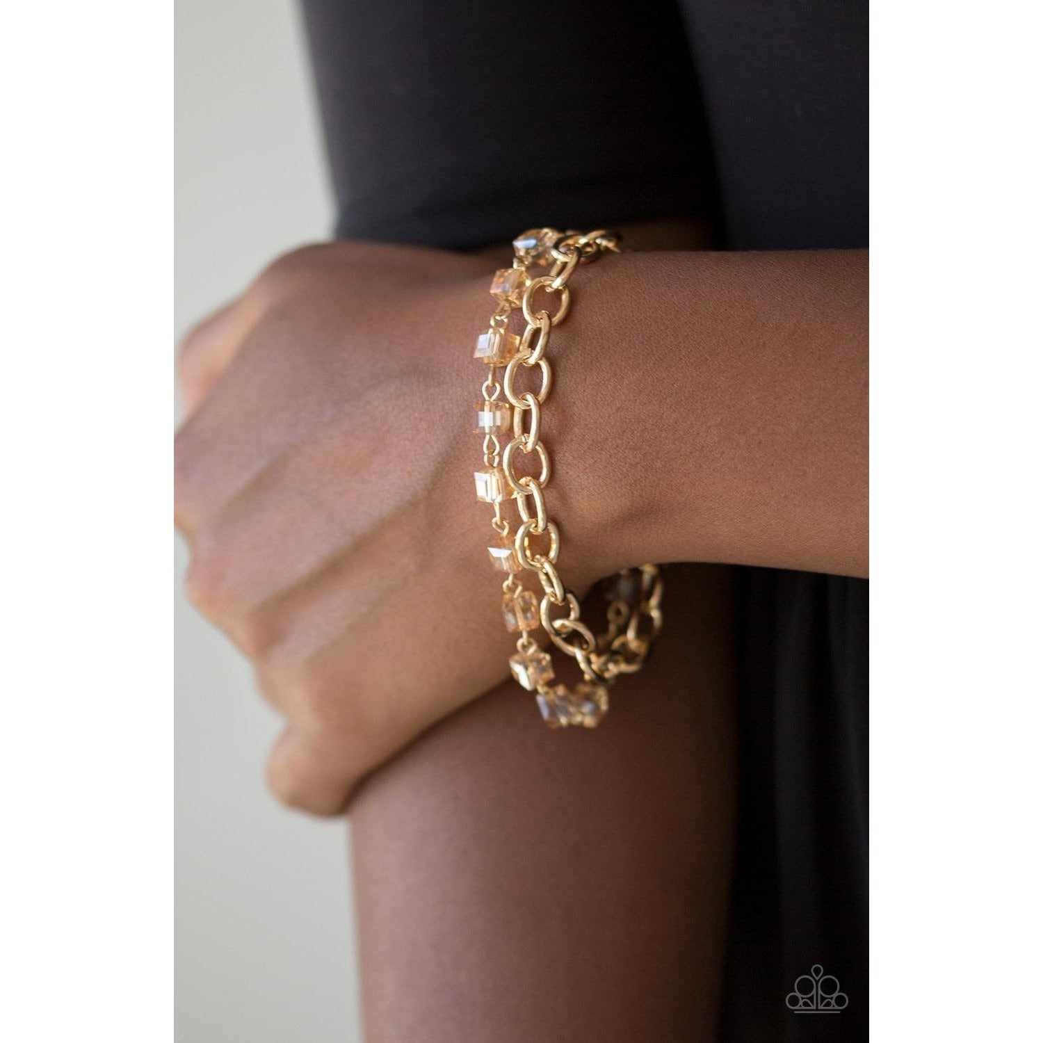 A strand of golden crystal-like cube beading joins a classic strand of gold chain around the wrist, creating refined layers. Features an adjustable clasp closure.