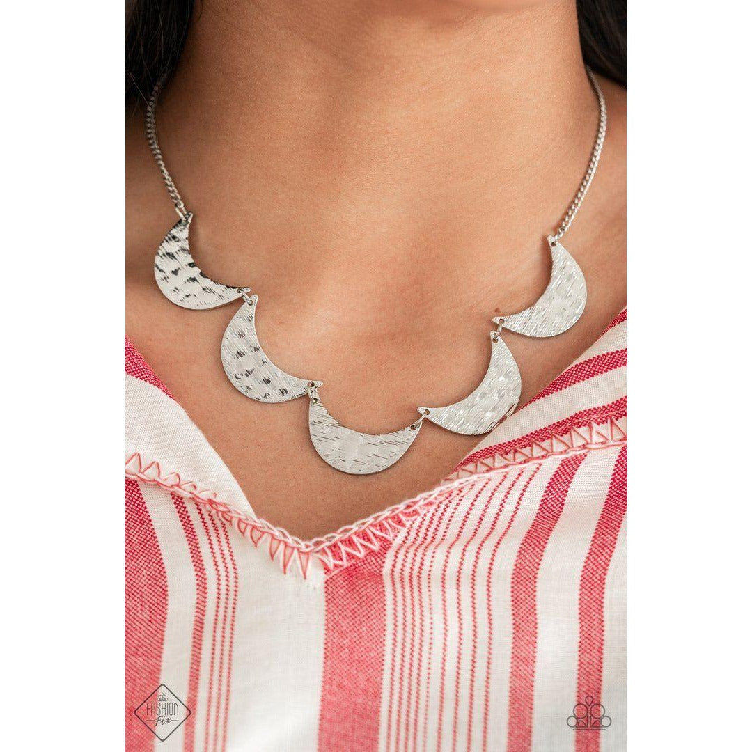 Embossed in metallic pebble-textures, delicately hammered half-moon silver frames link below the collar in a statement-making finish. Features an adjustable clasp closure.