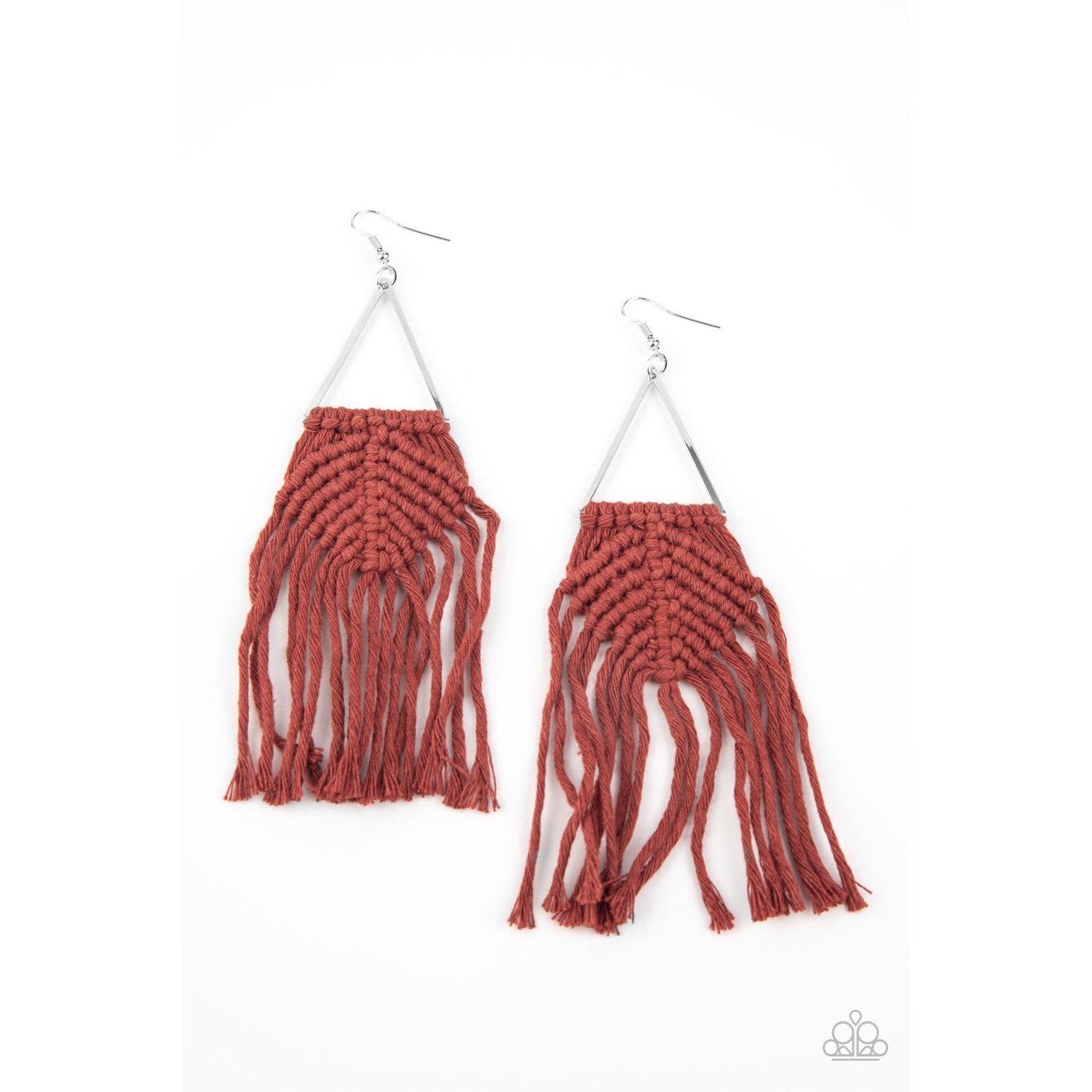 Fired Brick cording delicately knots and weaves around the bottom of an airy silver triangle, creating a colorful macramé inspired fringe. Earring attaches to a standard fishhook fitting.