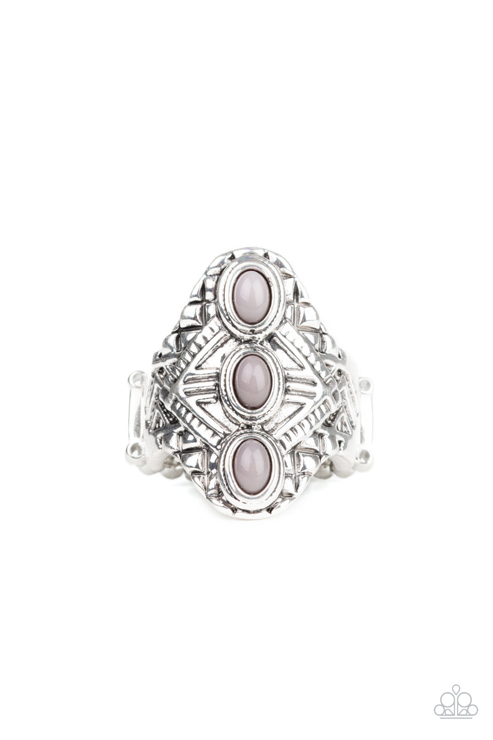 Three dainty gray beads stack along the center of an ornate silver frame embossed in shimmery geometric patterns for a bold tribal look. Features a stretchy band for a flexible fit.