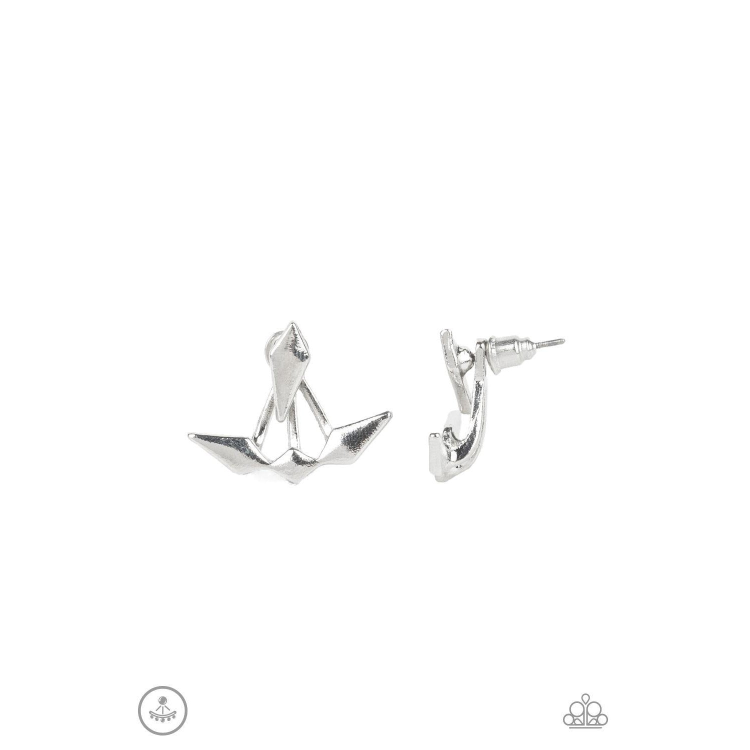 A solitaire silver kite-shaped frame attaches to a double-sided post, designed to fasten behind the ear. Infused with matching kite-shaped frames, the double sided-post peeks out beneath the ear for an edgy look. Earring attaches to a standard post fitting.