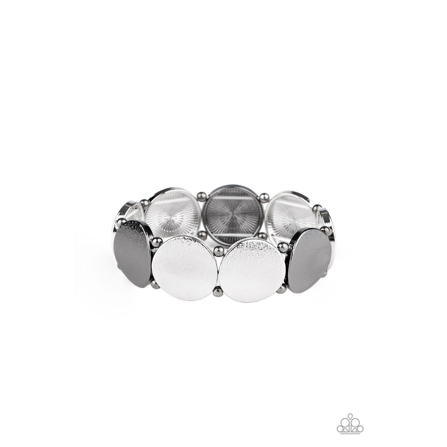 Infused with pairs of dainty gunmetal beads, delicately hammered gunmetal and silver discs slide along a stretchy band around the wrist for a hint of industrial flavor.