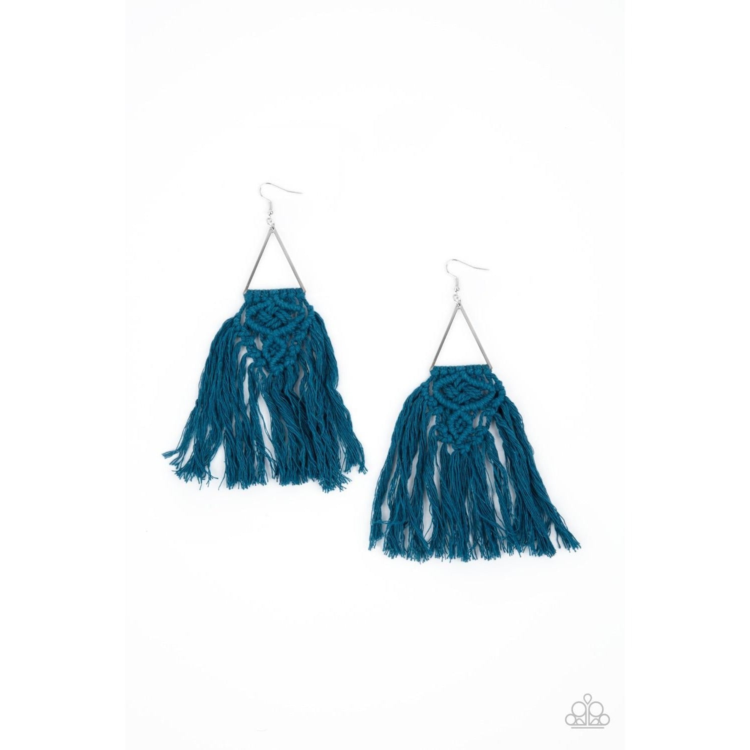 Blue threaded tassels ornately knot at the bottom of a shimmery silver triangular frame, creating a macramé inspired fringe. Earring attaches to a standard fishhook fitting.