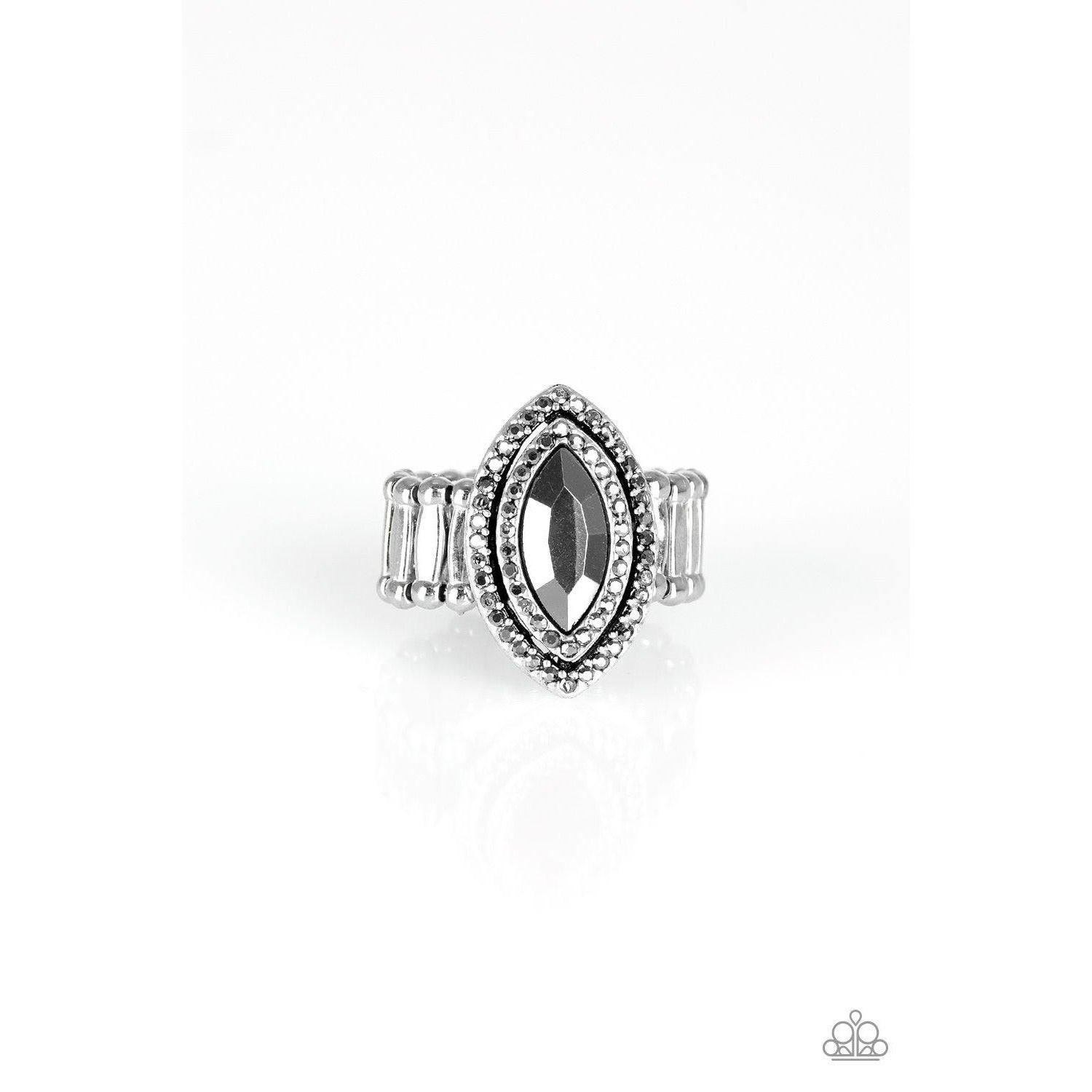 Featuring a regal marquise style cut, a glittery hematite gem is pressed into the center of stacked silver frames radiating with glittery hematite rhinestones for a glamorous finish. Features a stretchy band for a flexible fit.