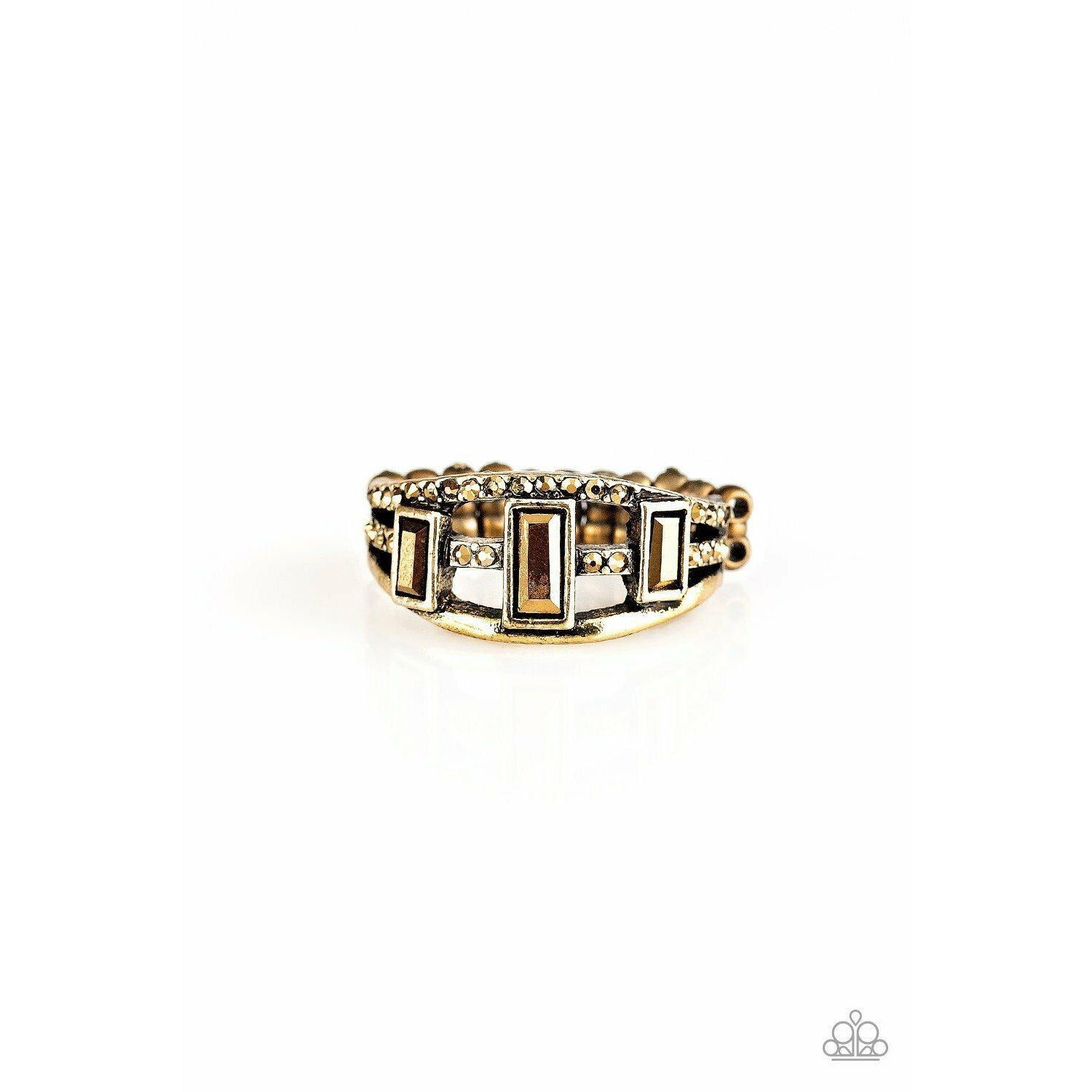 Three aurum emerald-cut rhinestones are encrusted along three brass bands radiating with smooth surfaces and sections of glittery aurum rhinestones for an edgy fashion. Features a stretchy band for a flexible fit.