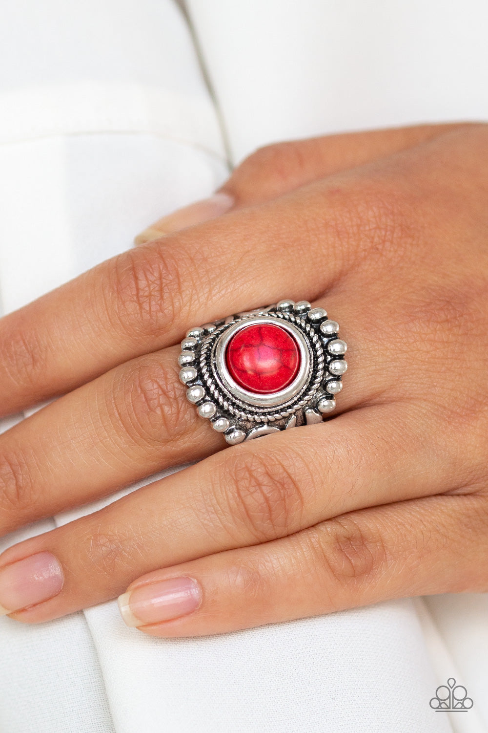 A fiery red stone is pressed into the center of a round silver frame studded in shiny silver studs for a rustic look. Features a stretchy band for a flexible fit.