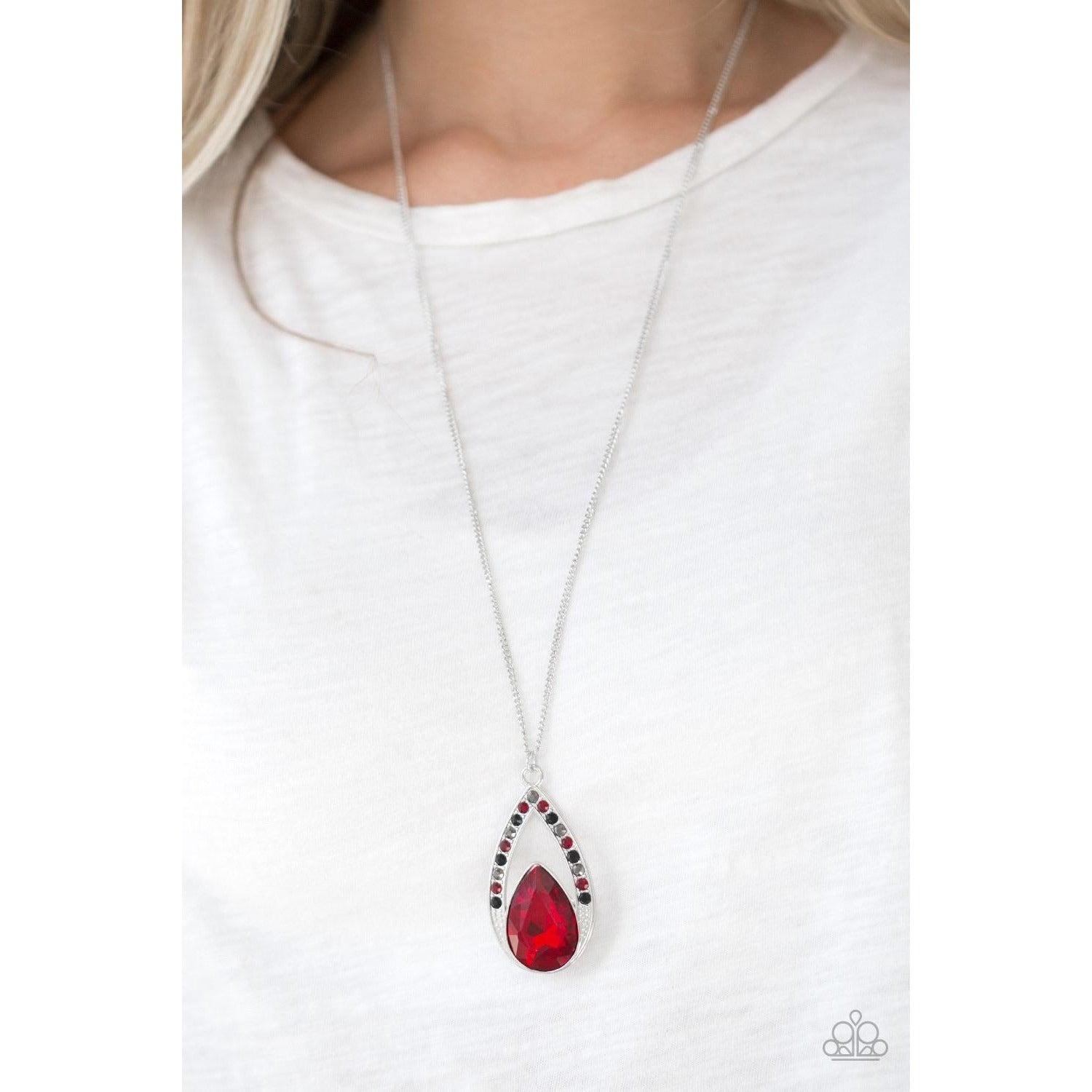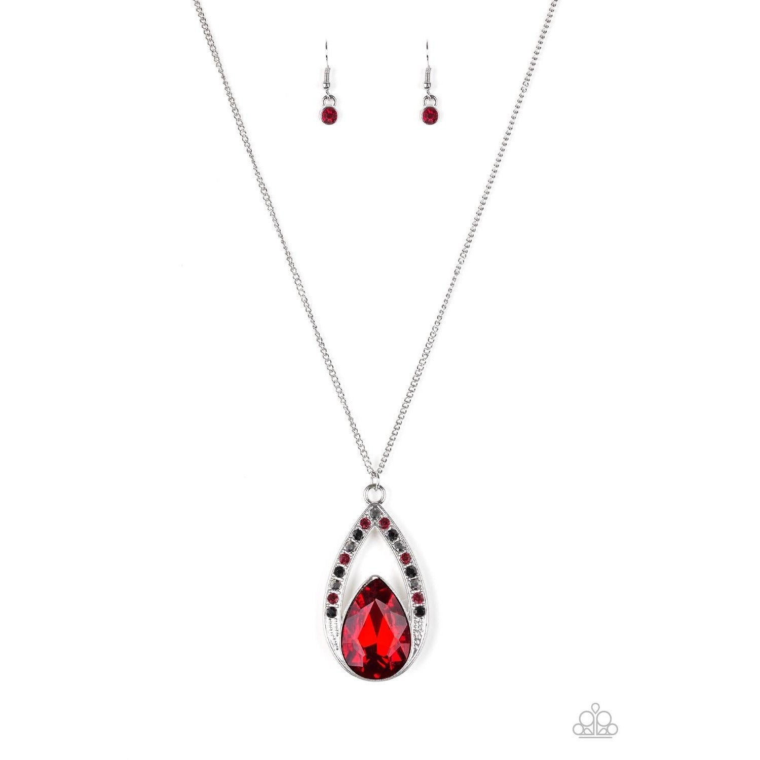 A fiery red teardrop gem is pressed into a silver frame radiating with black, hematite, and red rhinestones. The glamorous pendant swings from the bottom of a shimmery silver chain for a refined look. Features an adjustable clasp closure.