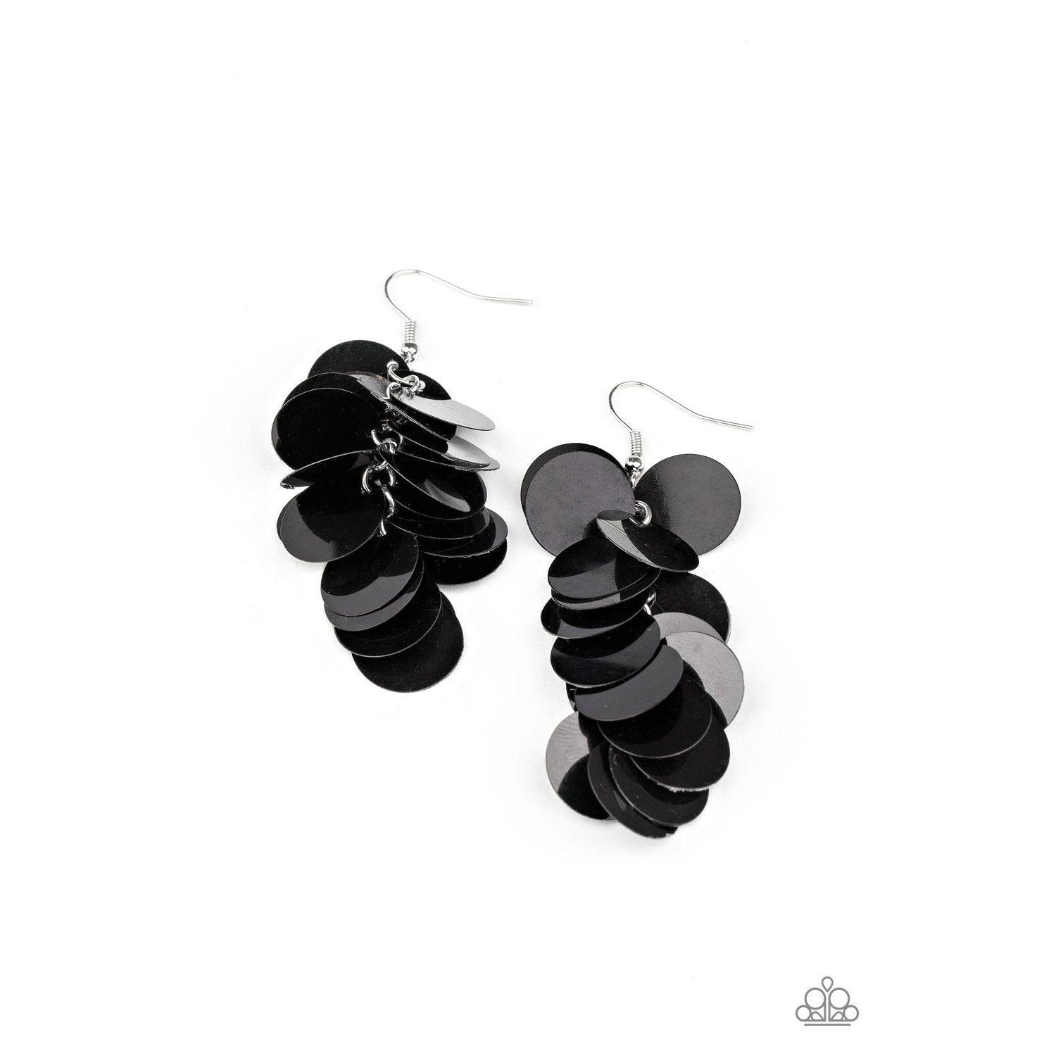 A cluster of bubbly black sequins dangle from the ear, creating effortless effervescence. Earring attaches to a standard fishhook fitting.