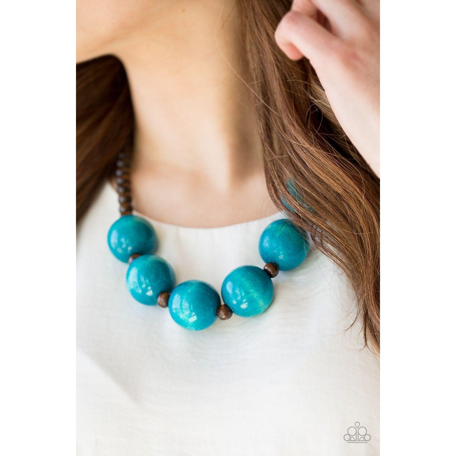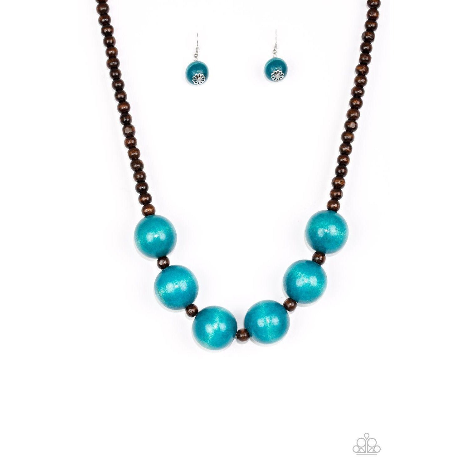 Brown wooden beads are threaded along shiny brown cording. Brushed in a vivacious finish, dramatic blue wooden beads alternate below the collar for a bold summer look. Features a button loop closure.