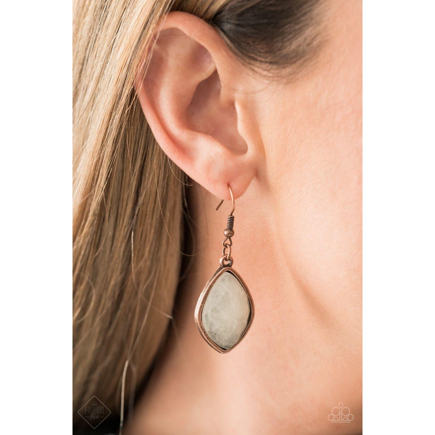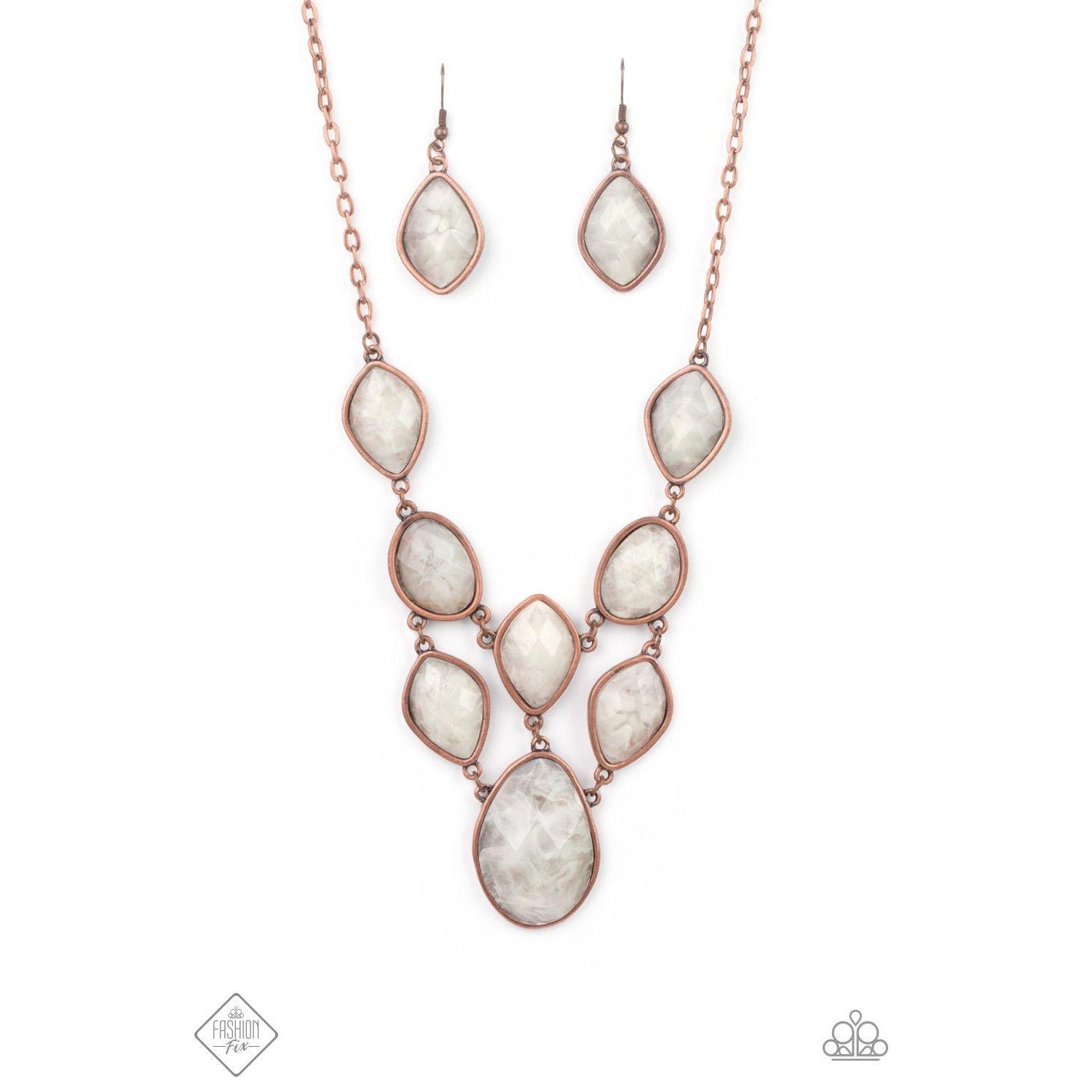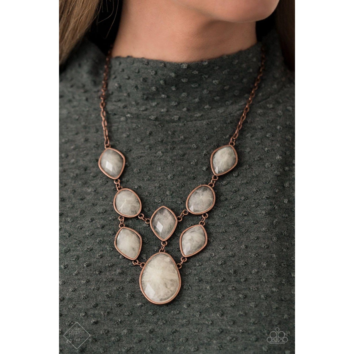 Featuring faceted surfaces, a collection of cloudy faux stone beads are pressed into rustic copper frames as they link into a mystical netted display below the collar. The asymmetrical frames and staggered placement add a unique handcrafted vibe to the piece, enhancing its rustic charm. Features an adjustable clasp closure.