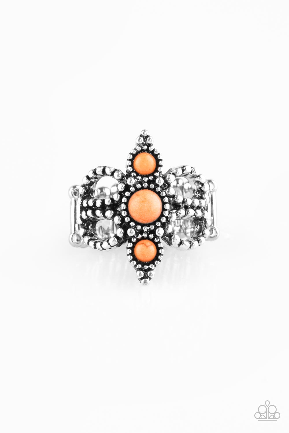 Dainty orange stones stack down the center of a frilly silver band radiating with studded textures. Features a stretchy band for a flexible fit.