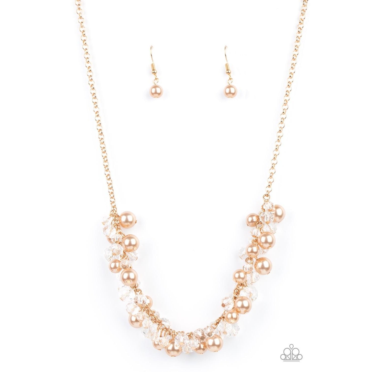 A royal collection of golden brown pearls and glassy crystal-like beads swing from the bottom of a dainty gold chain, creating a glamorously clustered fringe below the collar. Features an adjustable clasp closure.