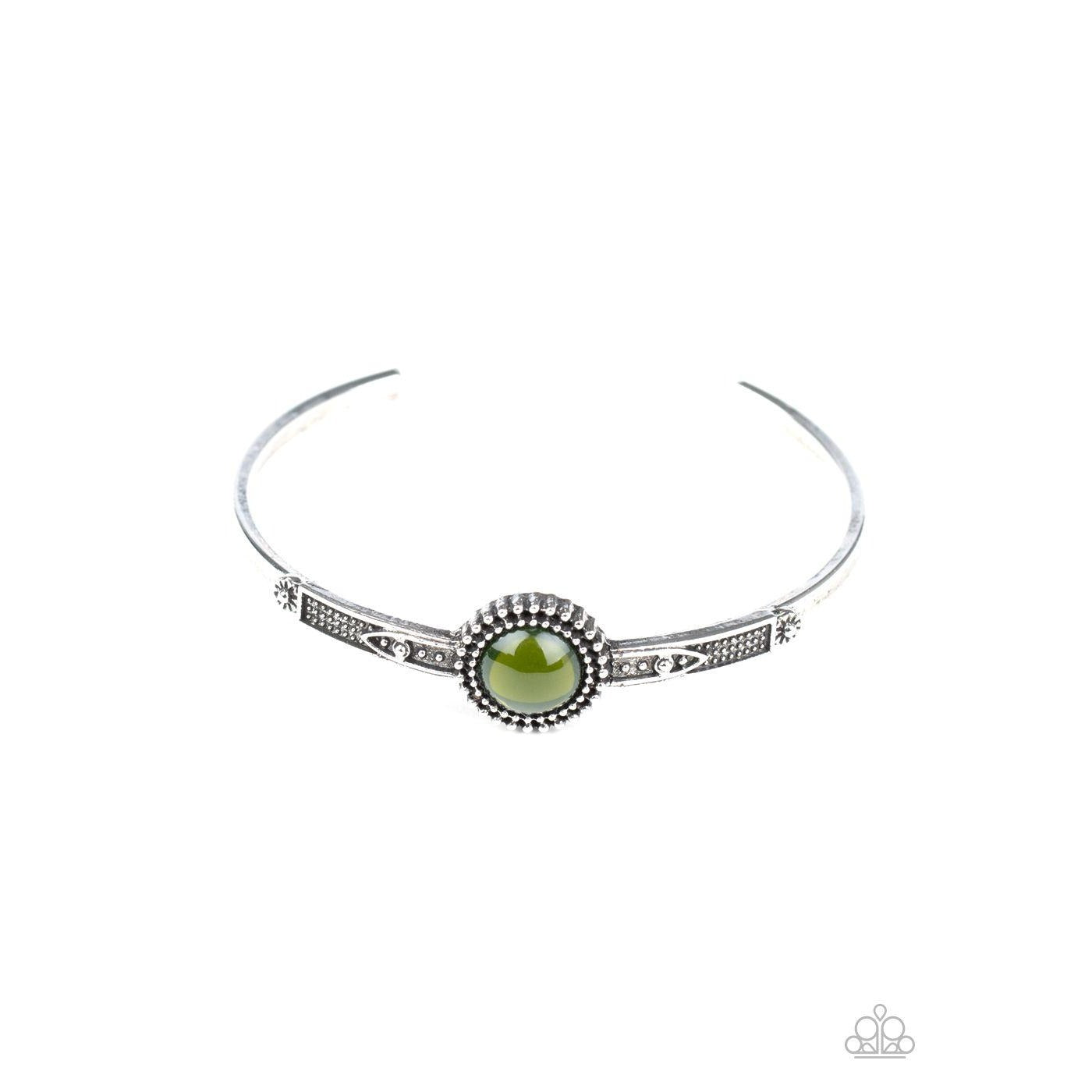 A glassy Military Olive bead is pressed into the middle of a studded silver frame atop a decorative cuff, creating a colorfully dainty display around the wrist.