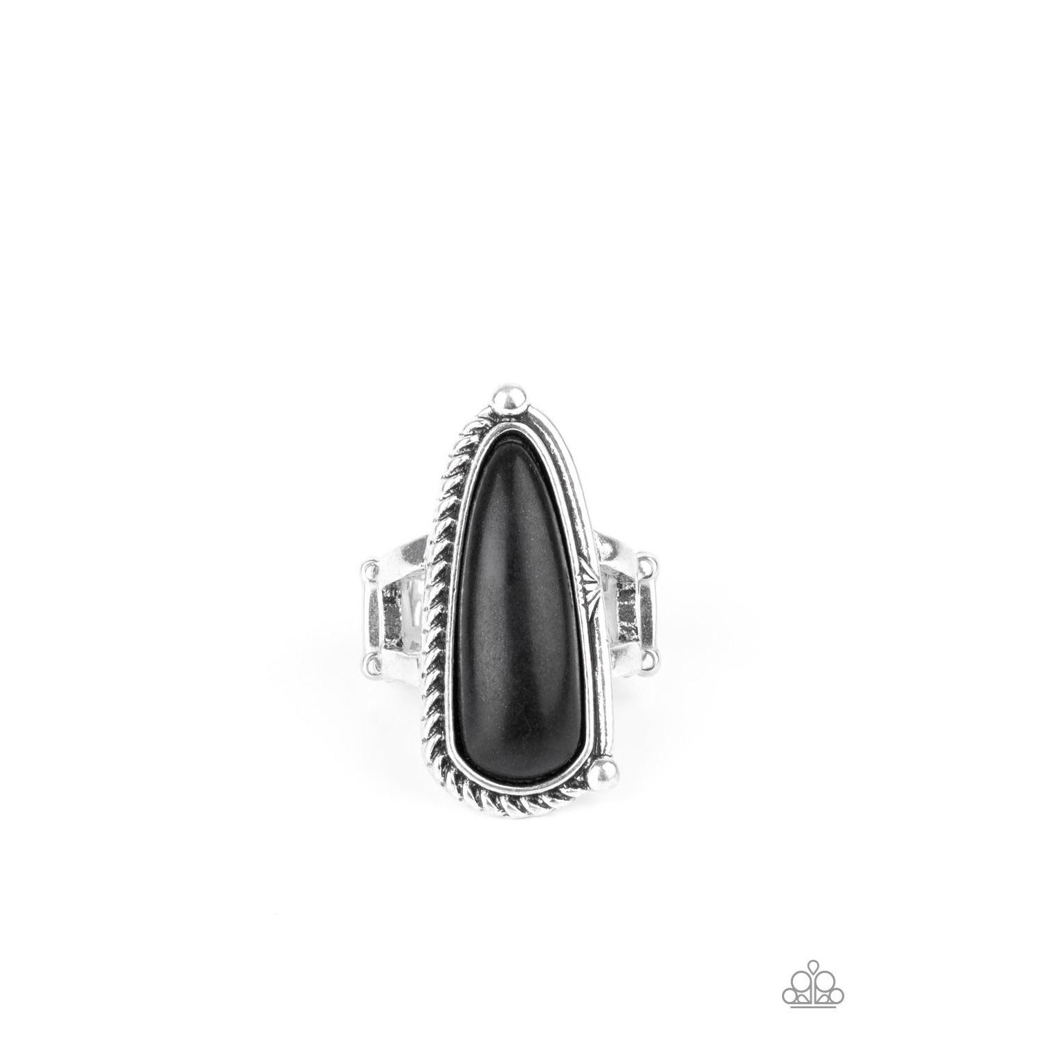 Chiseled into an oblong teardrop shape, an earthy black stone is pressed into an asymmetrically patterned silver frame for an artisan inspired look. Features a stretchy band for a flexible fit.