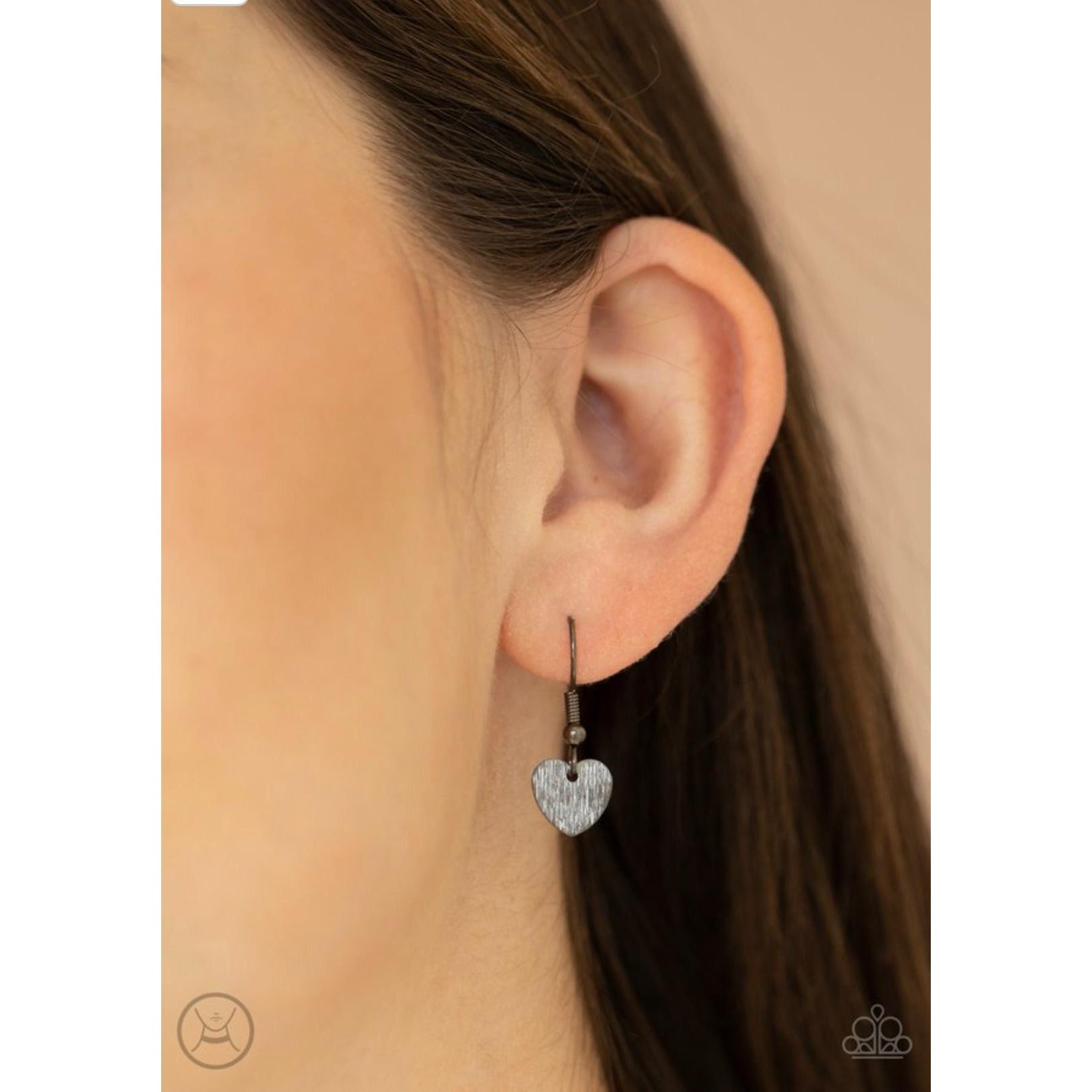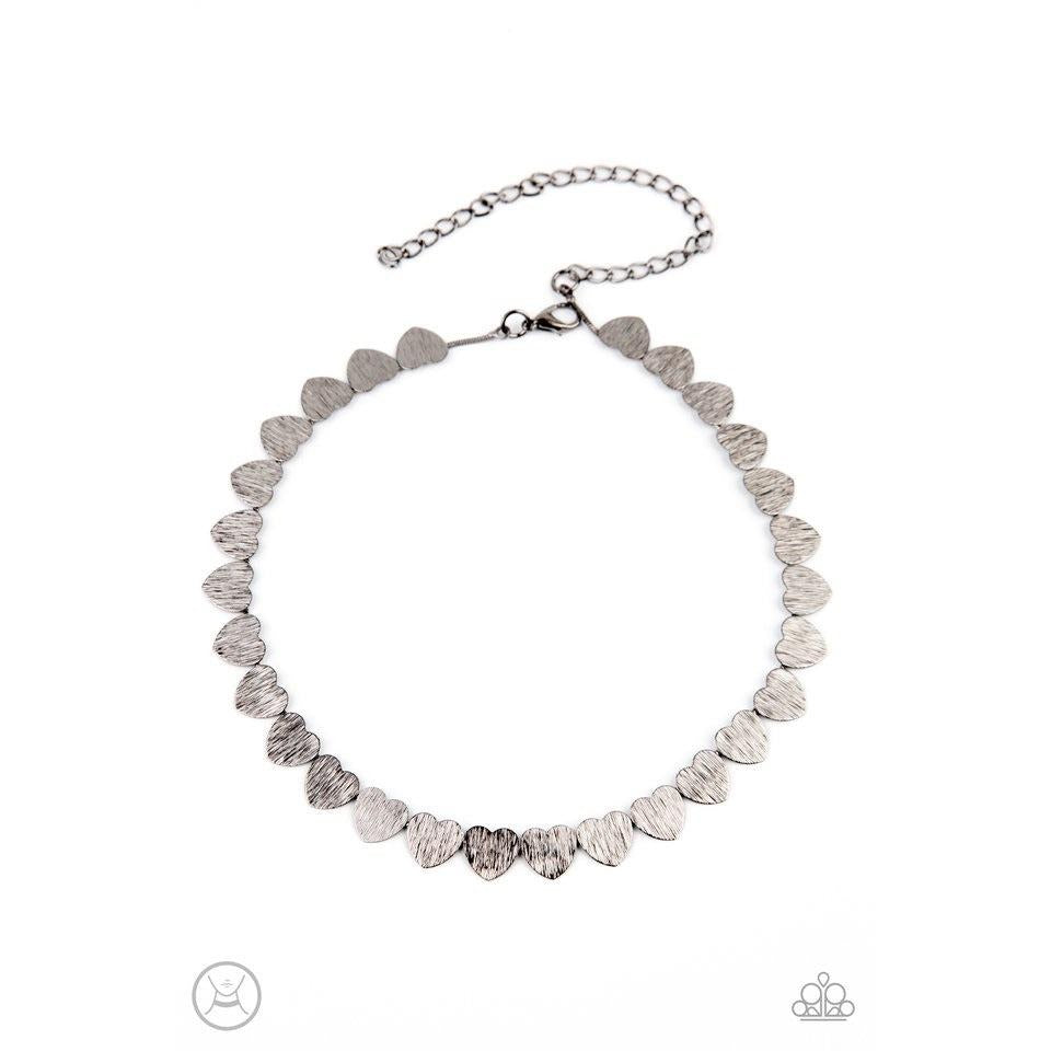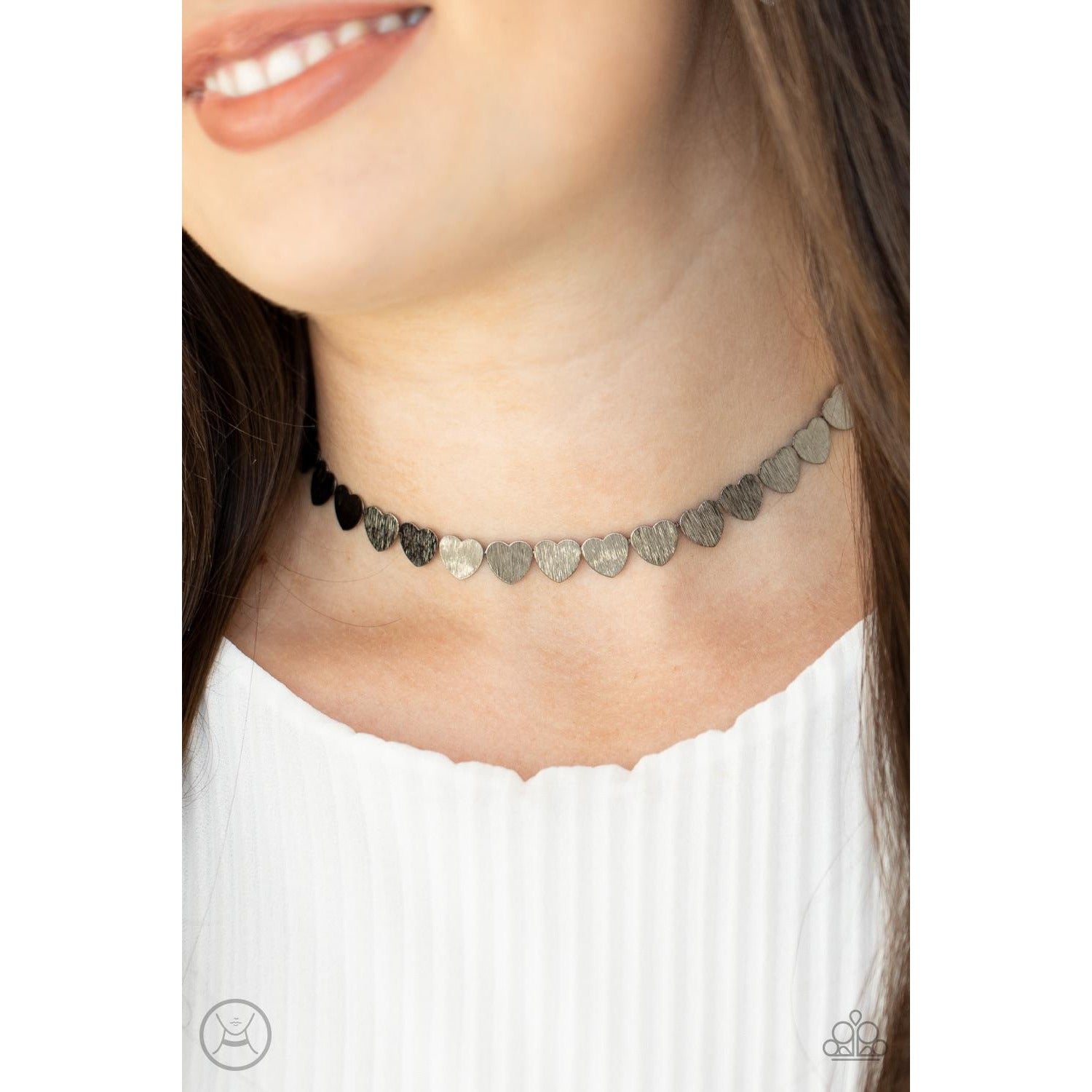 Featuring a shimmery scratch finish, a dainty collection of shiny gunmetal heart frames connect around the neck for a flirtatious look. Feature an adjustable clasp closure.