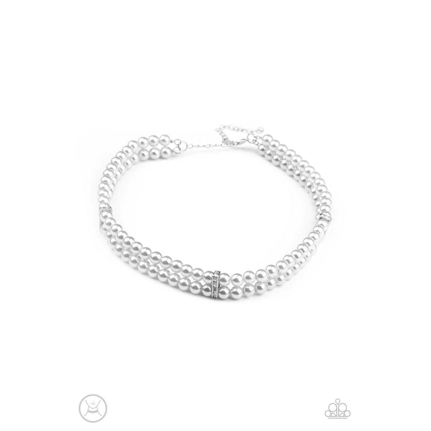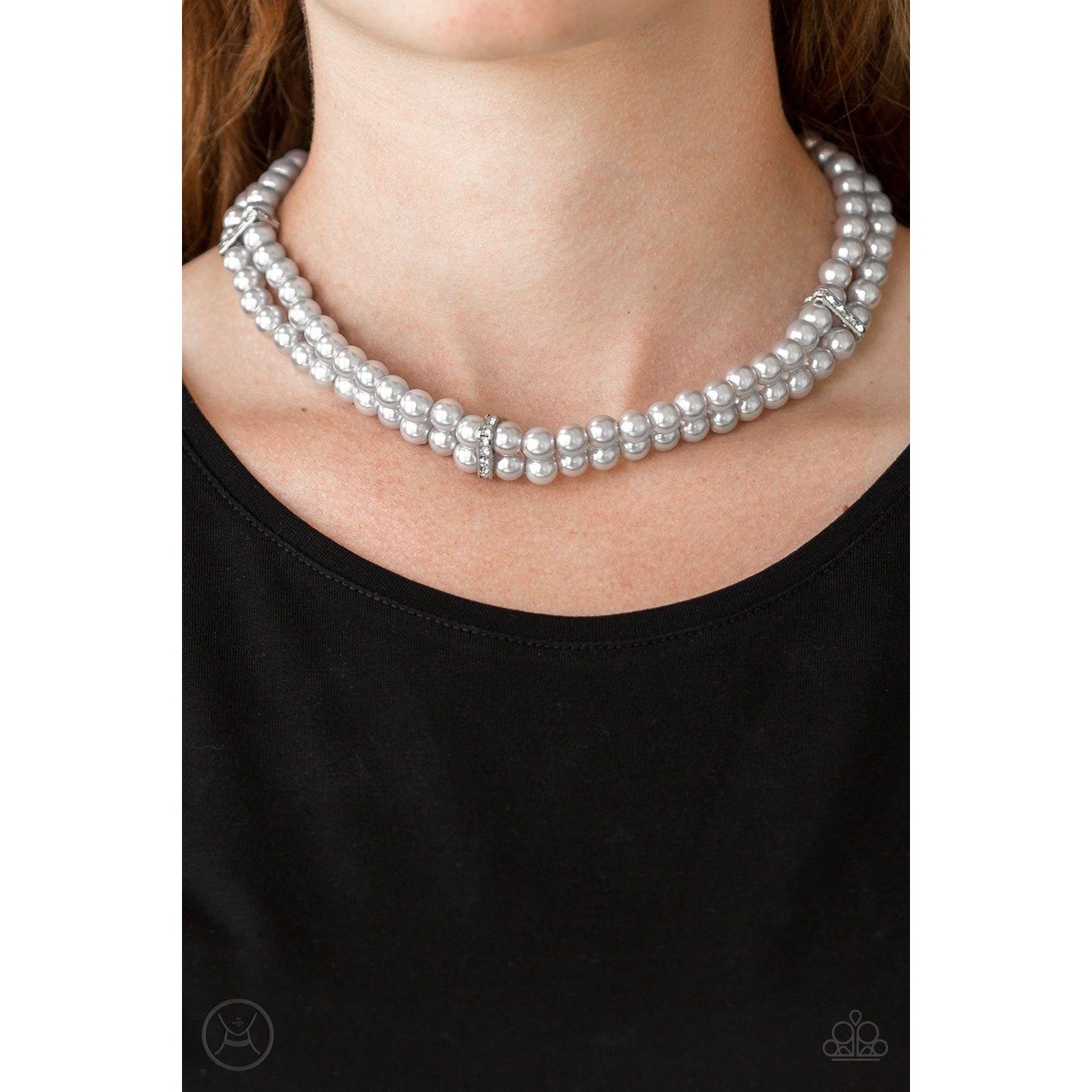 Pinched between white rhinestone encrusted frames, strands of classic silver pearls layer around the neck for a timeless look. Features an adjustable clasp closure.