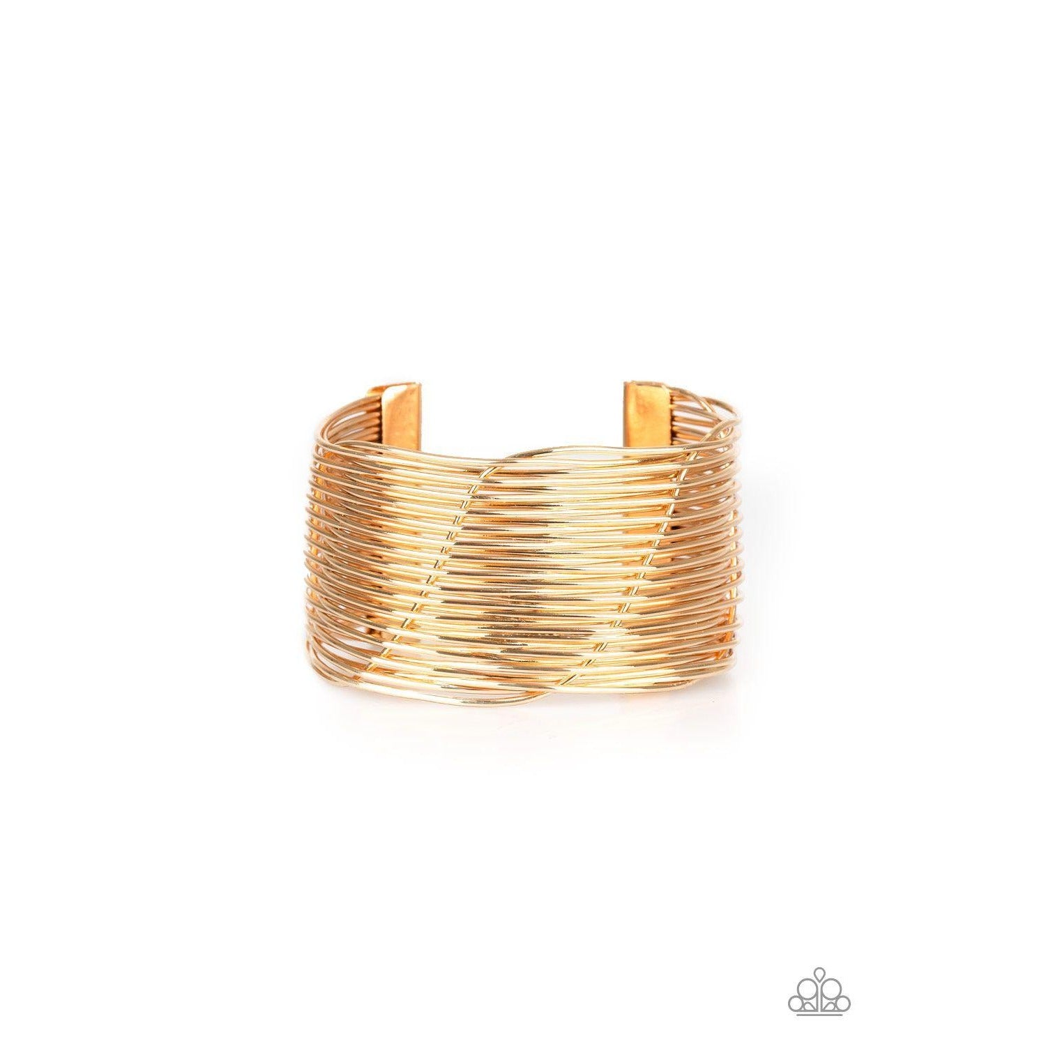 A glistening gold wire weaves through stacked gold bars arcing across the wrist, coalescing into an edgy cuff.