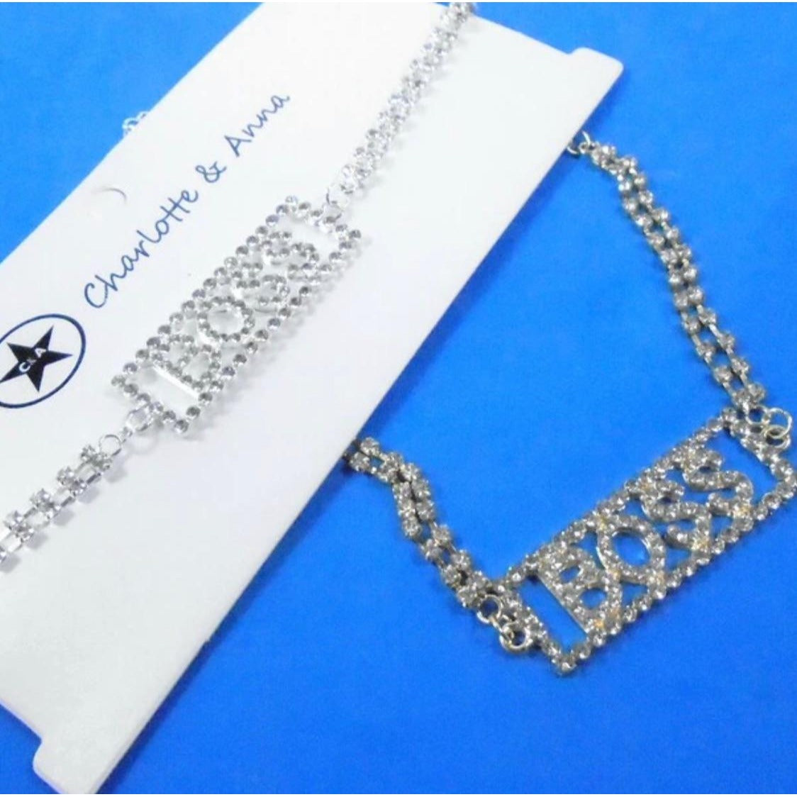 Rhinestone Choker Necklace w/ Crystal Stone BOSS Plaque
