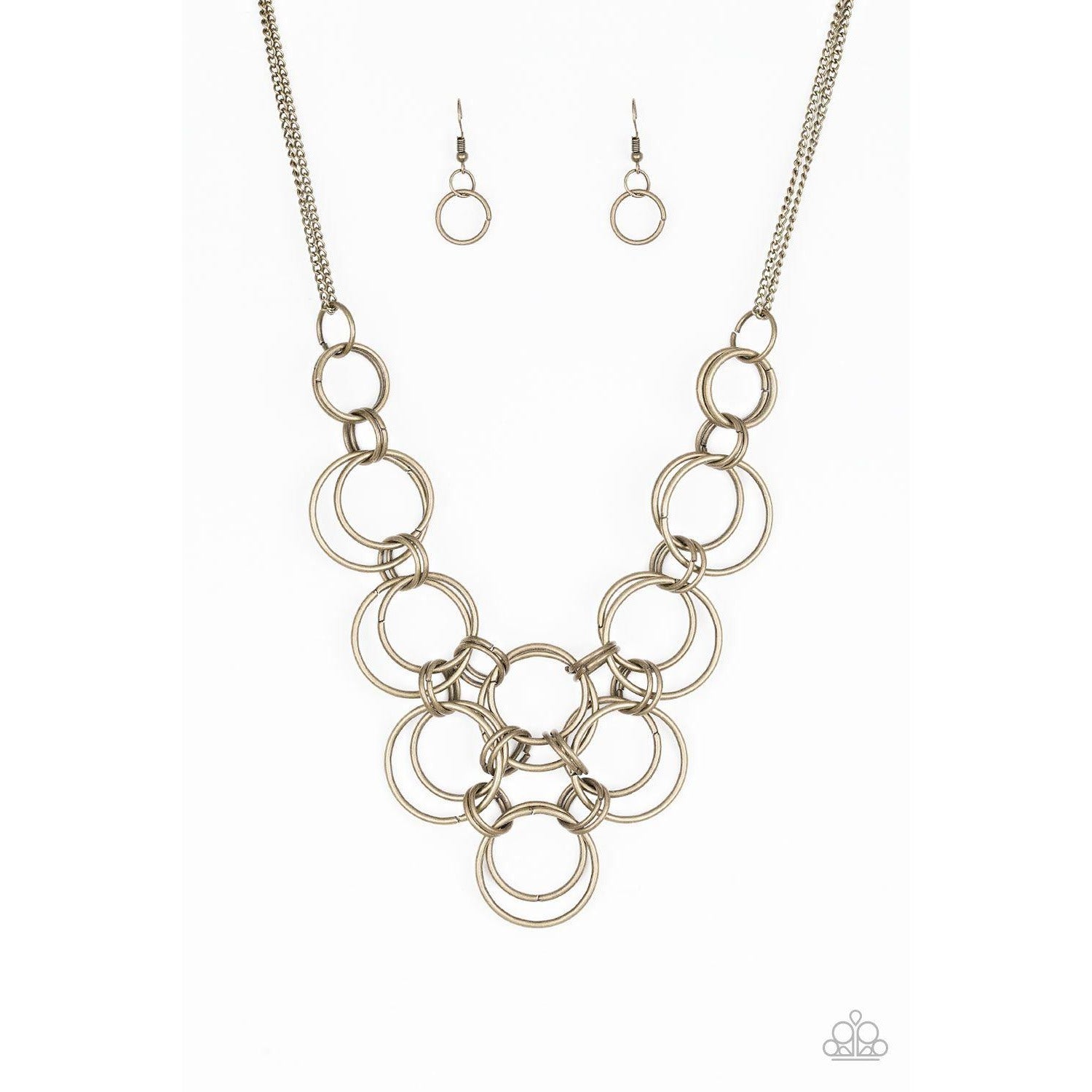 Brushed in an antiqued shimmer, brass rings link together below the collar, creating a bold interlocking pendant. Features an adjustable clasp closure.