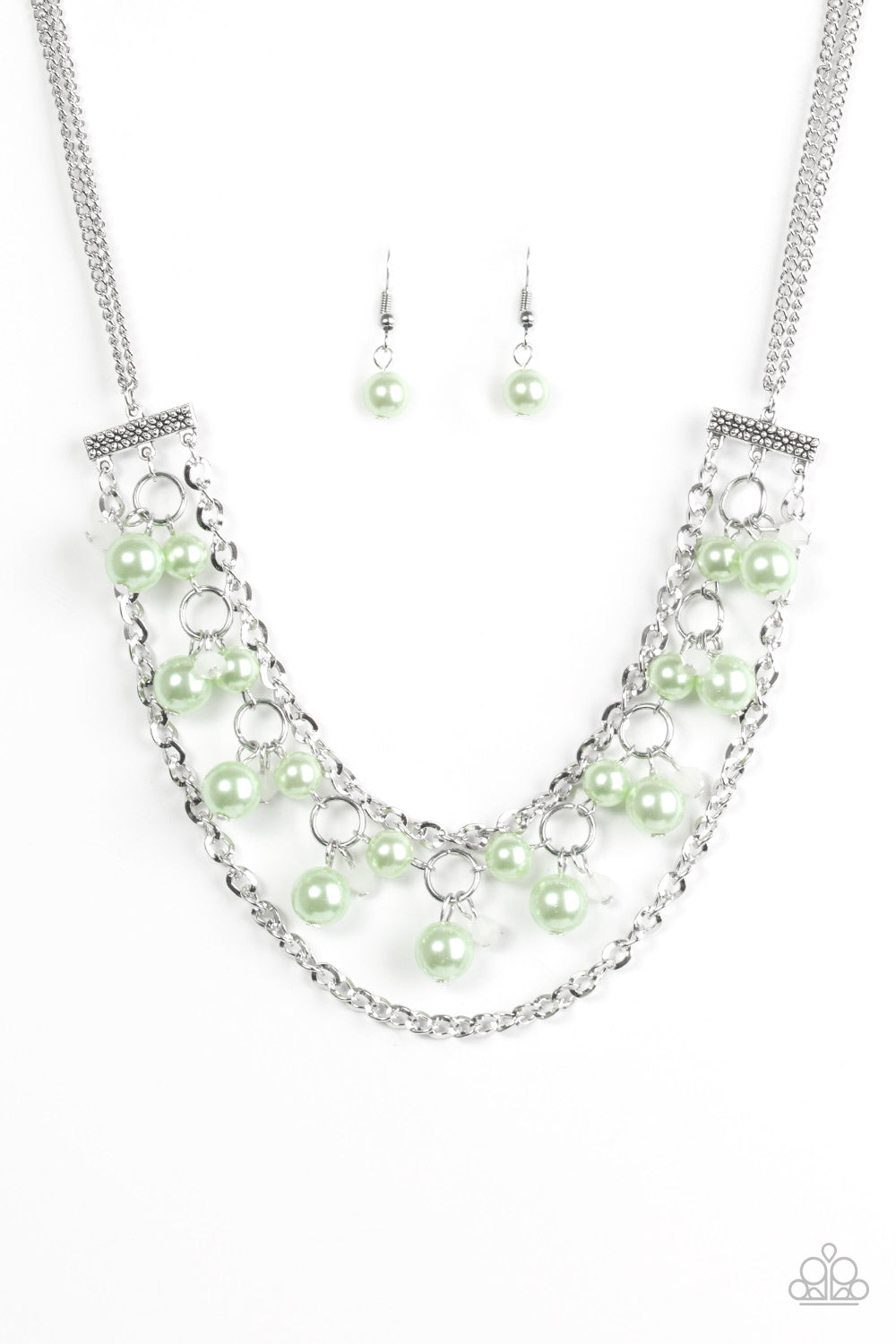 Attached to two floral fittings, rows of shimmery silver chains flank a pearly beaded strand below the collar. Dramatic green pearls and faceted crystal-like beads swing from the centermost strand for a refined finish. Features an adjustable clasp closure.