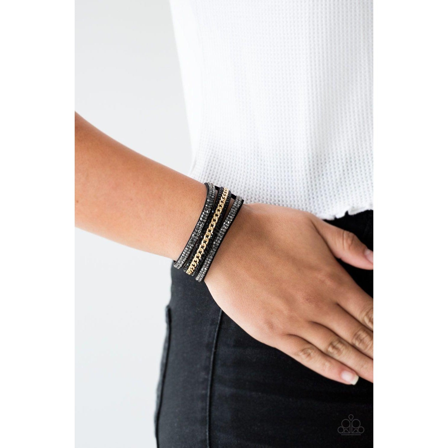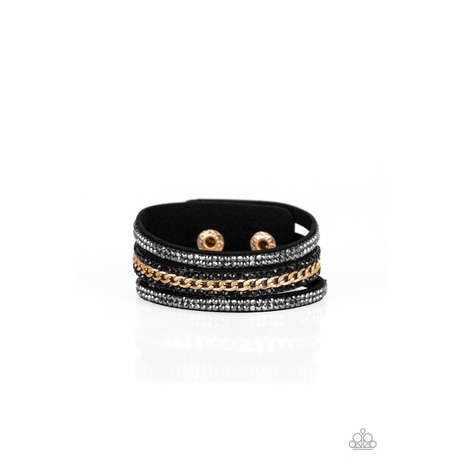 Rows of glassy hematite and black rhinestones and a shimmery gold chain are encrusted along black suede bands for a sassy look. Features an adjustable snap closure.