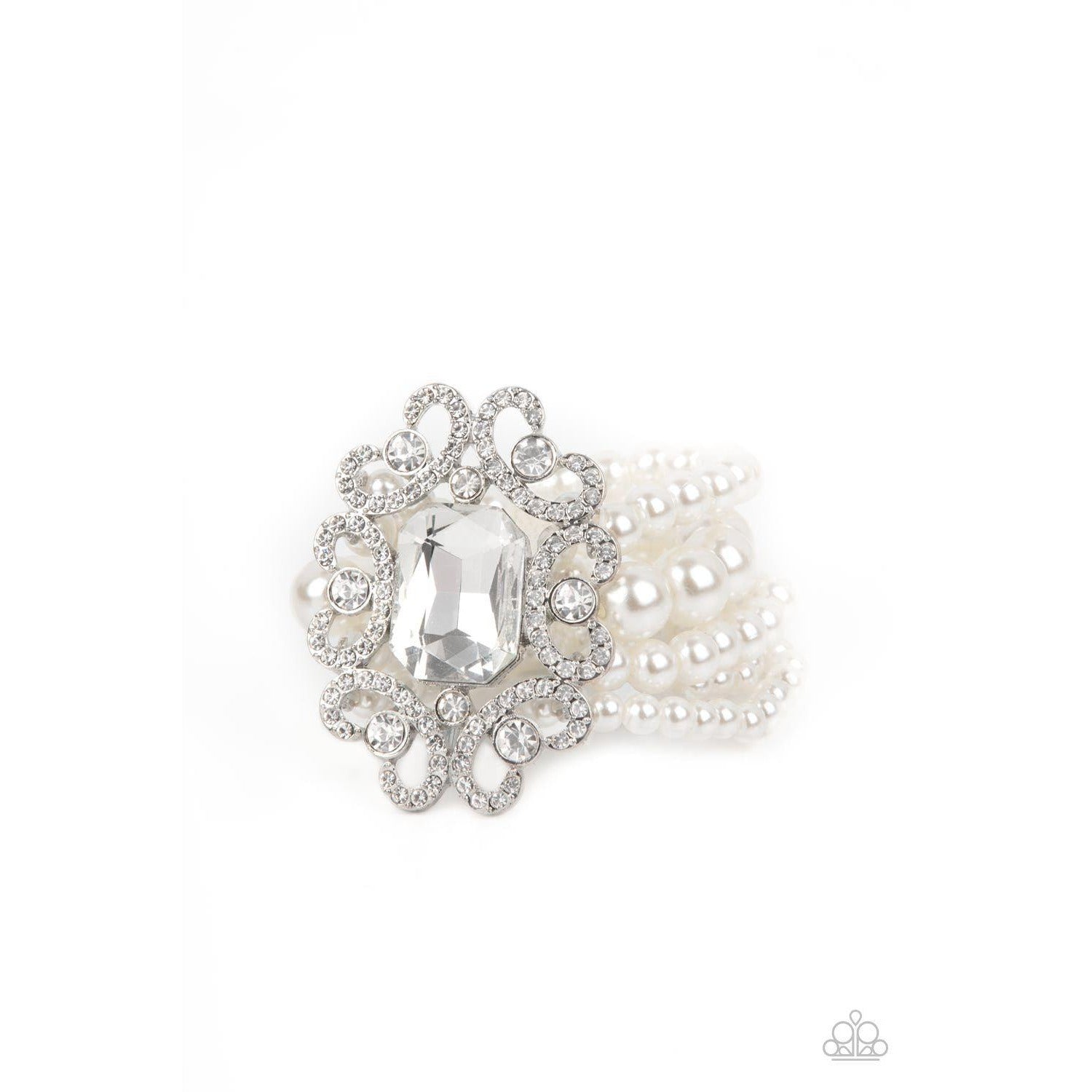 A dramatically oversized emerald cut gem adorns the center of a white rhinestone encrusted filigree filled frame. The blinding centerpiece attaches to bubbly rows of pearl beaded stretchy bracelets, creating a gorgeous statement piece.