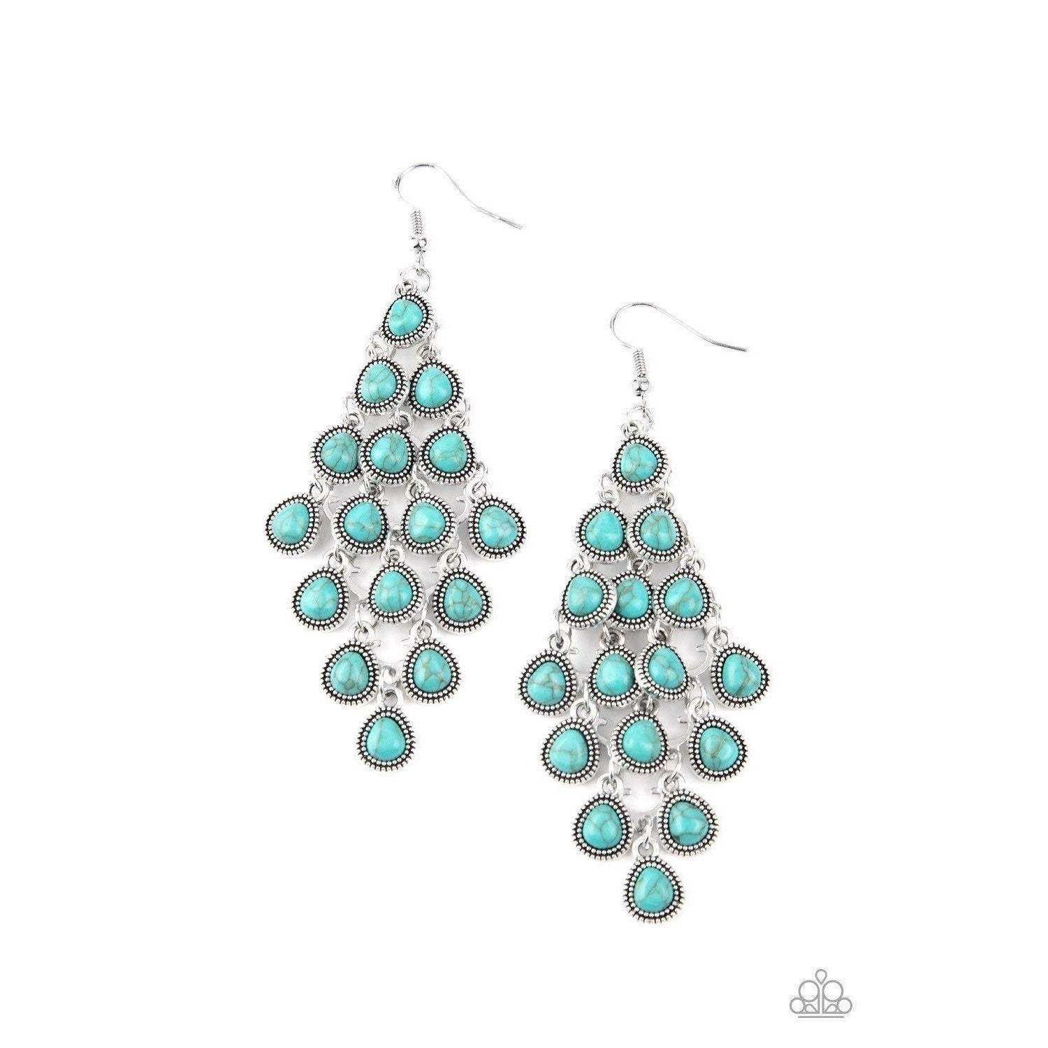 Featuring studded silver frames, dainty turquoise stone teardrops cascade from the ear. The earthy frames dangle from a netted backdrop, coalescing into a rustic lure. Earring attaches to a standard fishhook fitting.