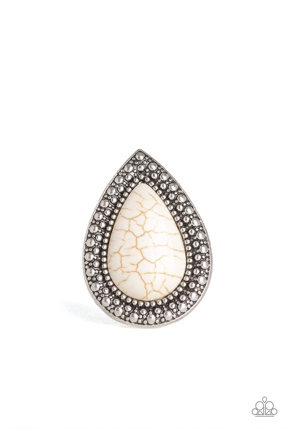 Chiseled into a tranquil teardrop, an oversized white stone is pressed into the center of a shimmery silver frame dotted with radiant studded texture for a dramatic stone look. Features a stretchy band for a flexible fit.