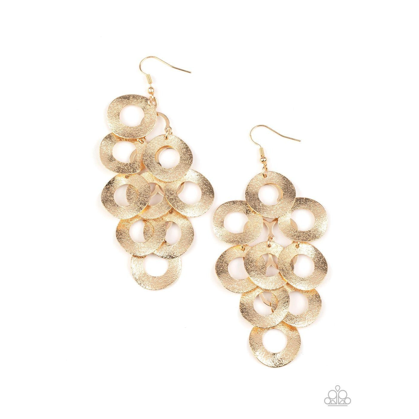 Delicately hammered in light-catching shimmer, rows of curved gold hoops delicately overlap into a noise-making lure. Earring attaches to a standard fishhook fitting.