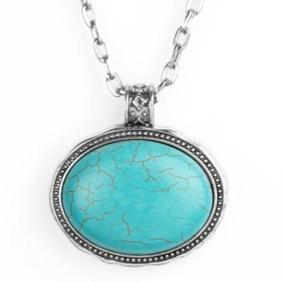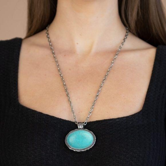Chiseled into a smooth oval, an oversized turquoise stone is pressed into a chunky silver pendant studded and hammered in antiqued detail. The earthy stone pendant attaches to a tribal patterned silver fitting, sliding along the bottom of a rustic silver chain for a statement-making finish. Features an adjustable clasp closure.