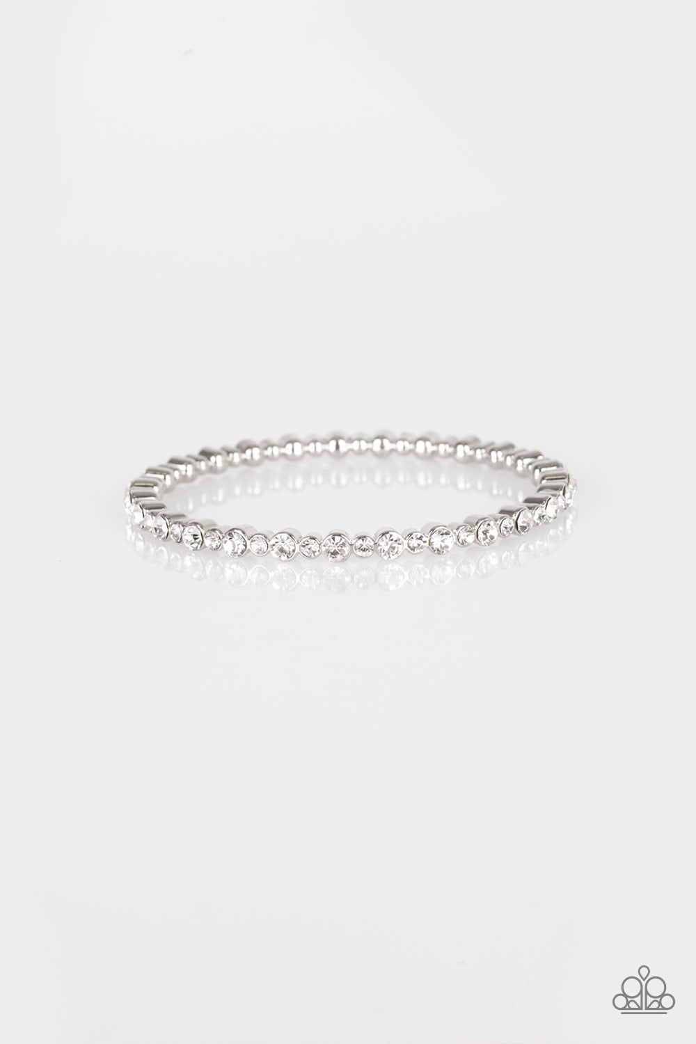 A glistening silver bangle is encrusted in countless white rhinestones for a timeless look.