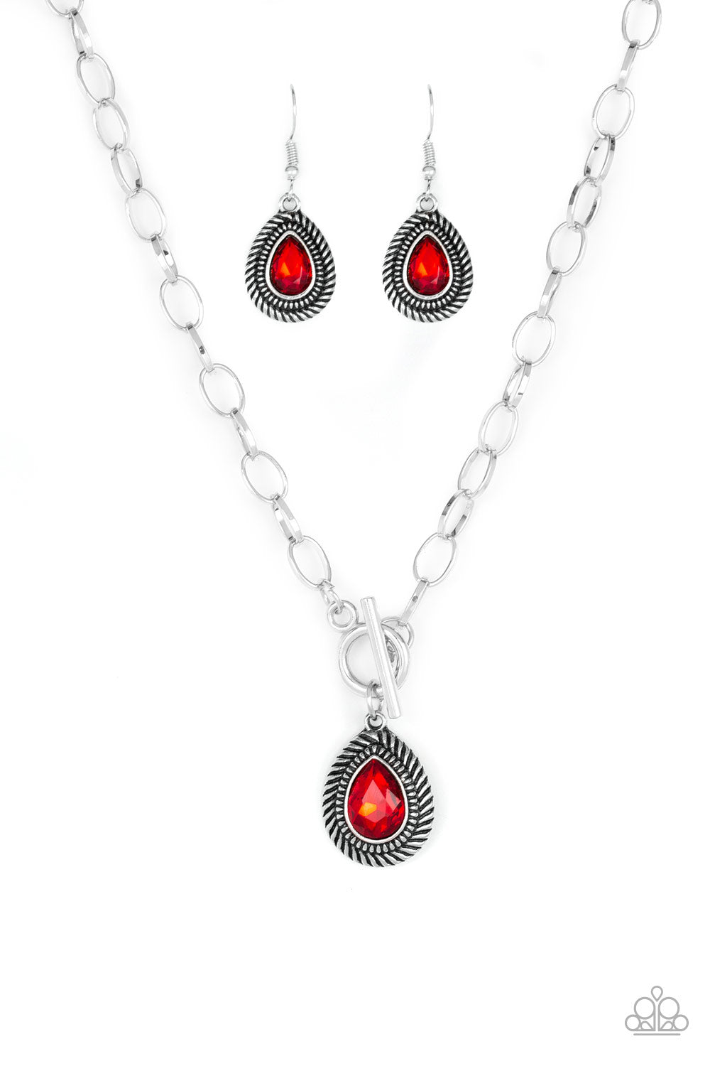 A faceted red teardrop gem is pressed into a textured silver frame. The glamorous pendant swings from a shimmery silver hoop below the collar for a statement-making fashion. Features a toggle closure.