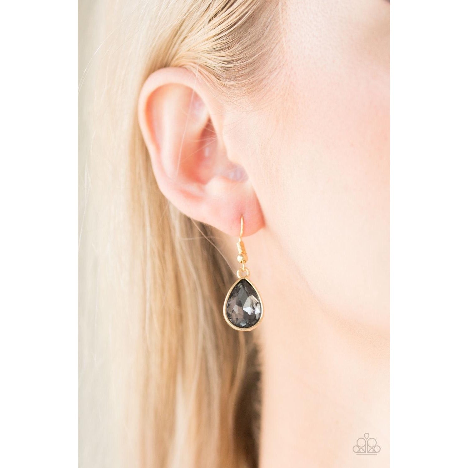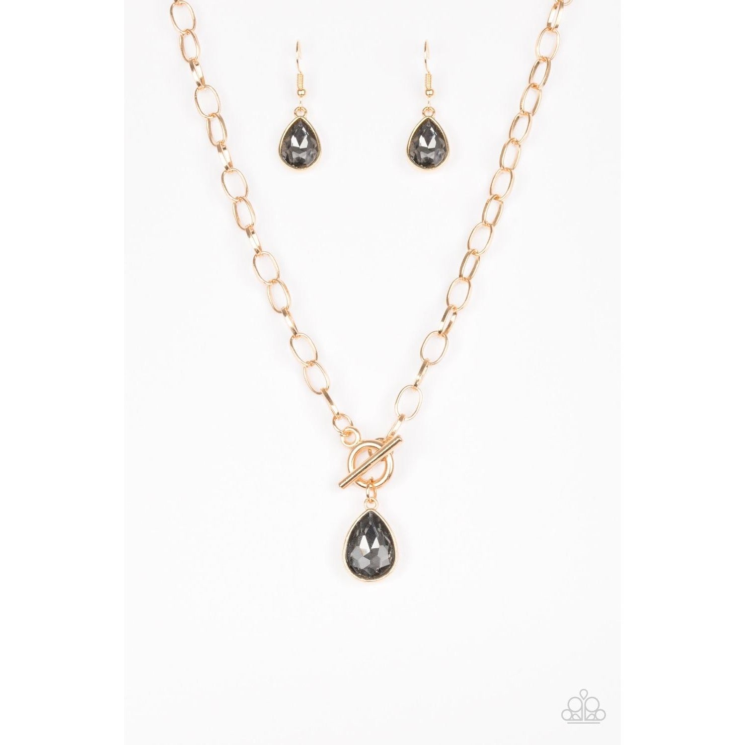 A smoky teardrop gem swings from the bottom of a shimmery gold chain, creating a classic pendant below the collar. Features a toggle closure.