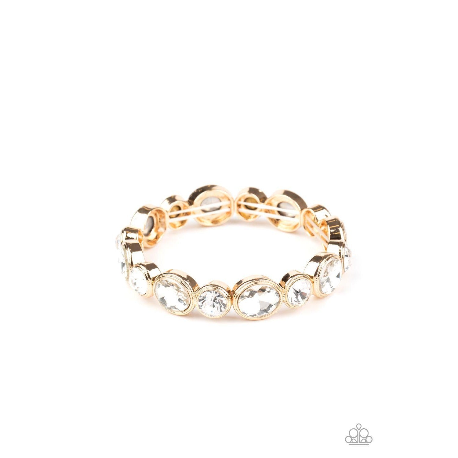 Encased in sleek gold frames, oval and round white rhinestones alternate along a stretchy band around the wrist for a timeless look.
