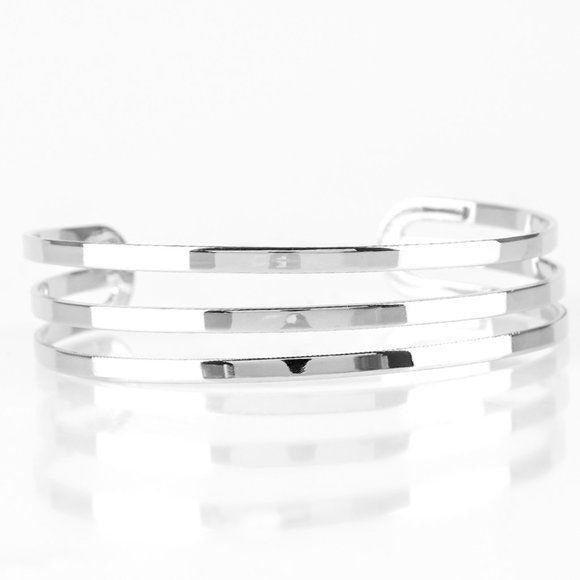 Flat silver bars race across the wrist, coalescing into a sleek cuff for a casual look.