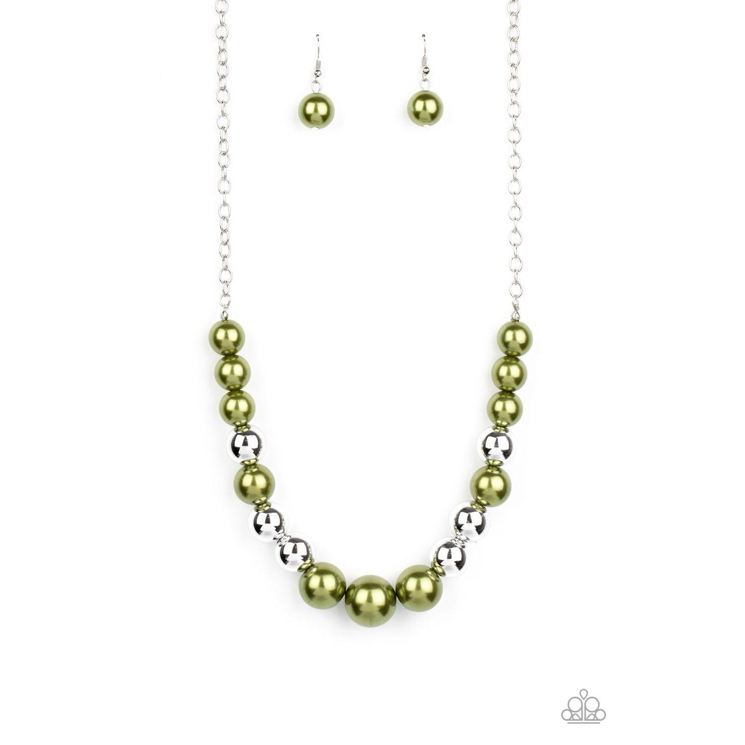 A collection of oversized silver and pearly green beads drape across the chest for a refined look. Features an adjustable clasp closure.