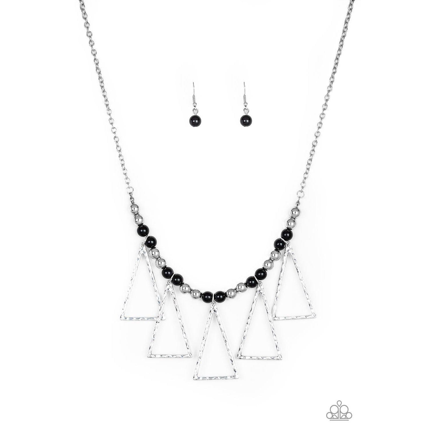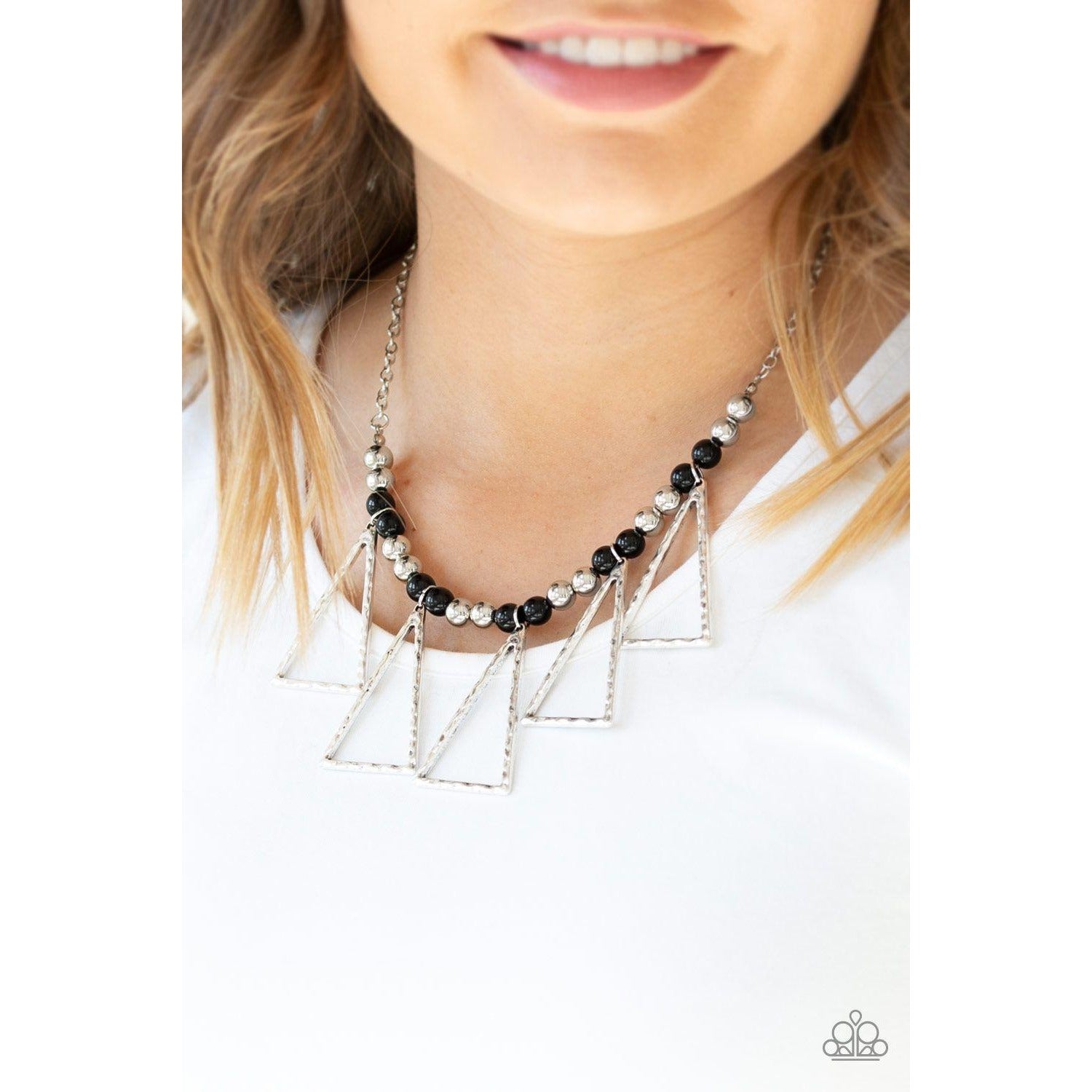 A collection of shiny silver and shiny black beads are threaded along an invisible wire below the collar. Hammered triangular frames swing from the bottom of the colorful compilation, creating an artistic fringe. Features an adjustable clasp closure.