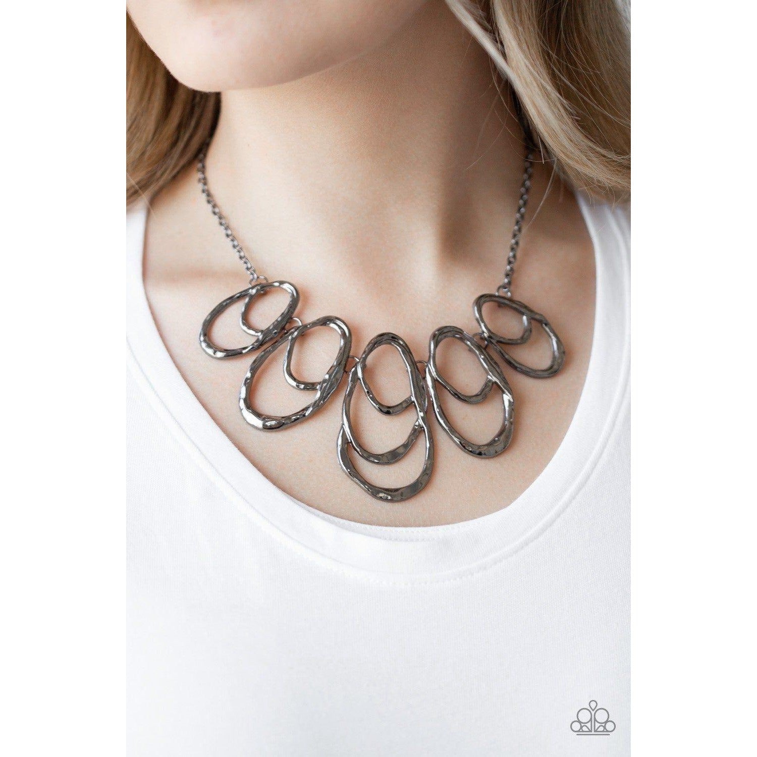 Delicately hammered gunmetal bars overlap into a collection of asymmetrical teardrops below the collar, creating a bold artisan inspired fringe. Features an adjustable clasp closure.