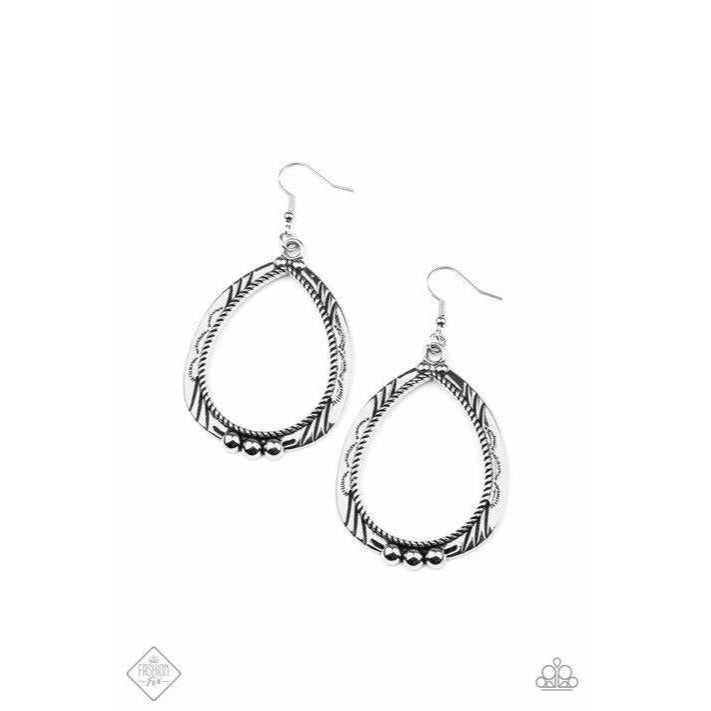 Decorated in metallic rope-like textures, a studded silver teardrop is stamped and etched in tribal inspired patterns for a rustic flair. Earring attaches to a standard fishhook fitting.