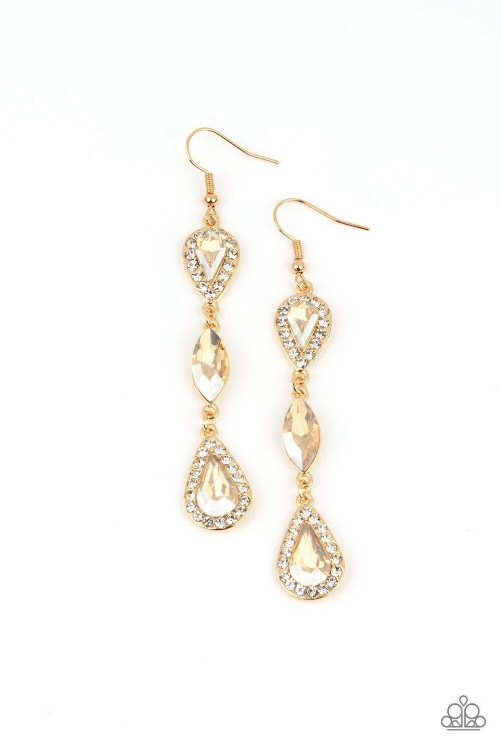 A trio of teardrop and marquis cut golden gems fall in succession from the ear. The teardrops are set in gold frames studded with white rhinestones for a sparkly finish. Earring attaches to a standard fishhook fitting.